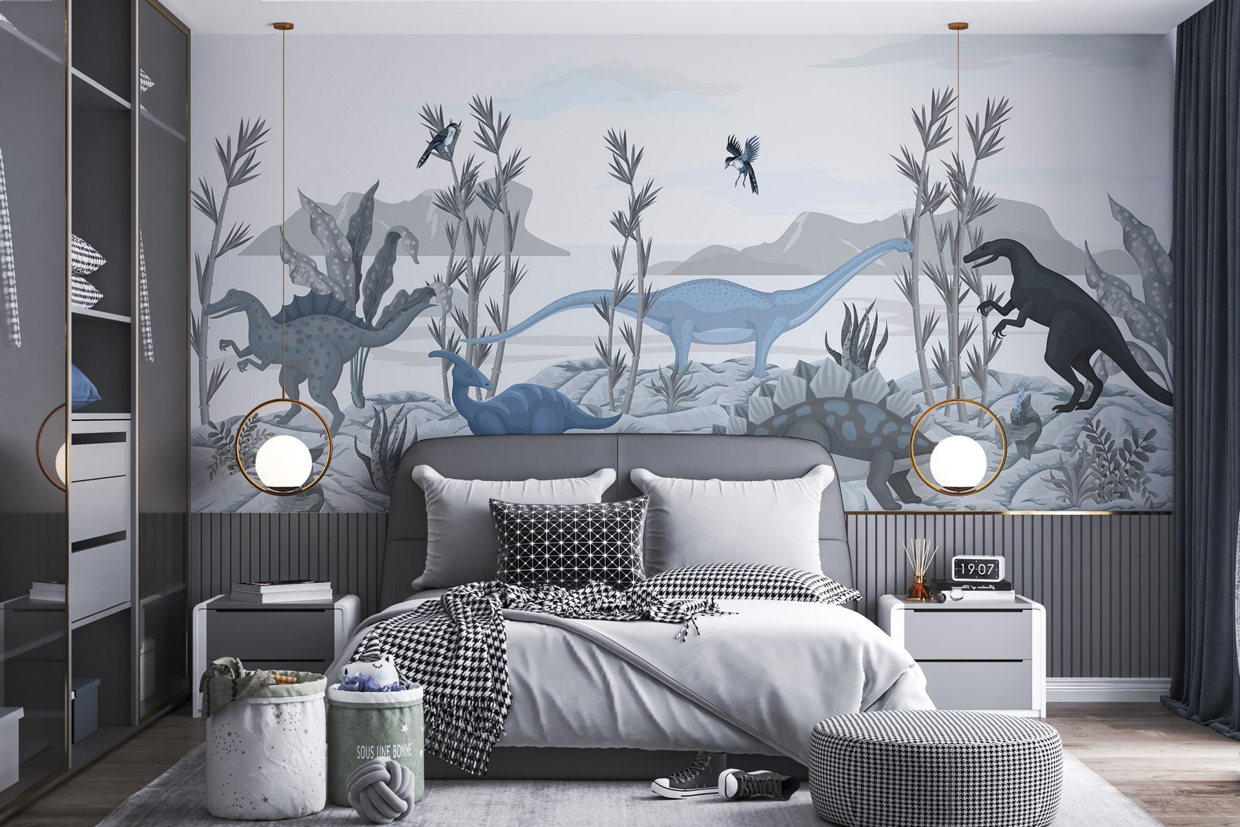 Przekształć przestrzeń dziecka w prehistoryczną przygodę dzięki tej urzekającej fototapecie z dinozaurami. Wyobraź sobie jasnookie maluchy odkrywające świat, w którym wędrują olbrzymy, a ich wyobraźnia szaleje wśród łagodnych brontozaurów i zaciekłych T. rexów. Kojące kolory i misterne detale krajobrazu tworzą spokojną atmosferę, idealną do snucia marzeń lub opowiadania bajek. Powieś go w pokoju zabaw lub sypialni i obserwuj, jak wzbudza ciekawość i zachwyt. To nie tylko mural – to zaproszenie do odkrywania świata, w którym każdy dzień może wydawać się nieco bardziej ryzykowny. Dzieci mogą nawet zacząć marzyć o eskapadach o tematyce dinozaurów!