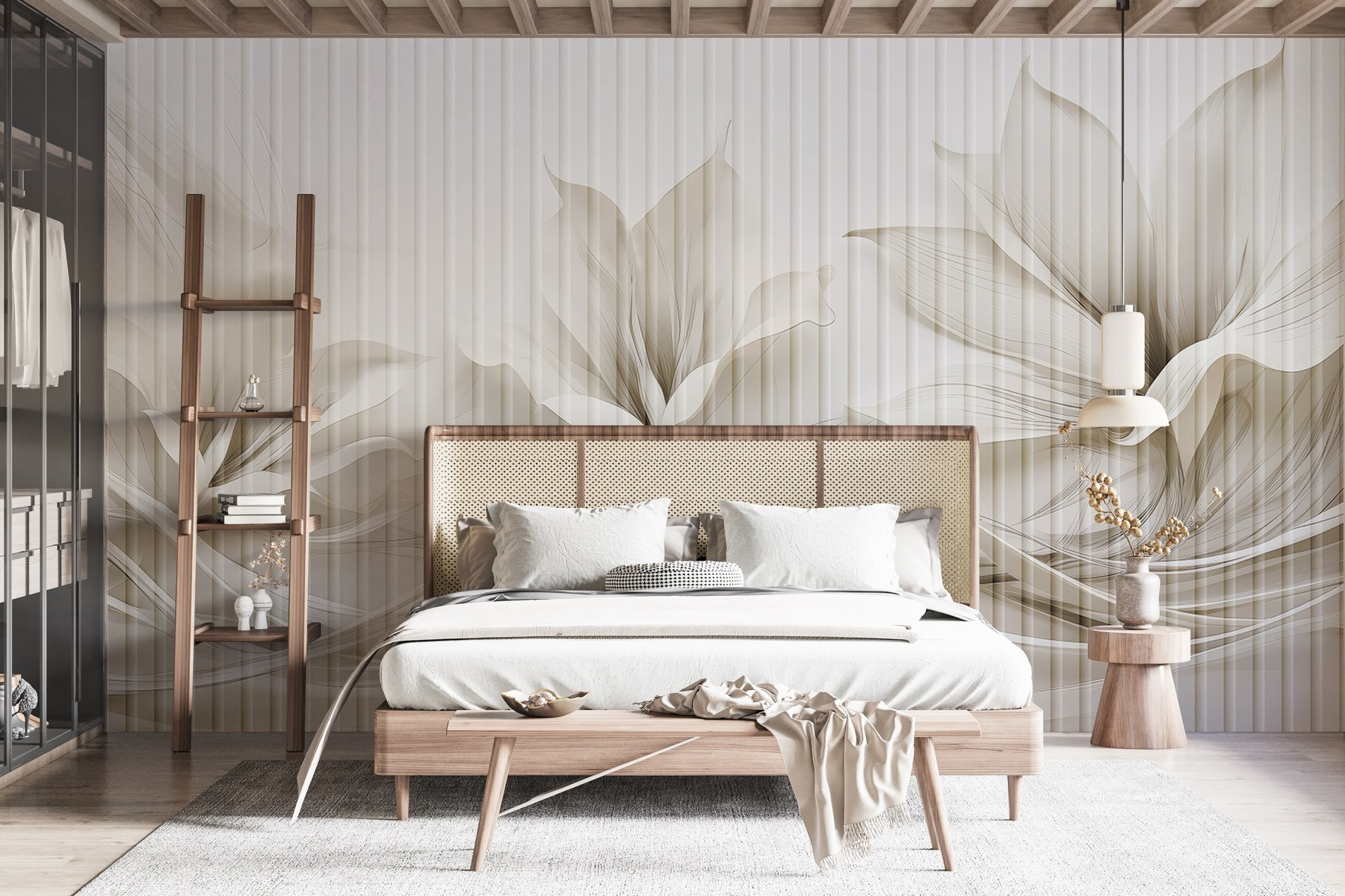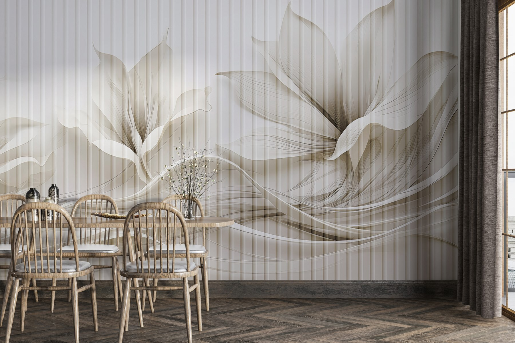 Odmień swoją przestrzeń dzięki tej oszałamiającej fototapecie ściennej z eleganckim kwiatowym wzorem przeplatanym płynnymi liniami. Wyobraź sobie, że wchodzisz do pokoju, w którym miękkie, stonowane odcienie natychmiast uspokajają zmysły. To jak powiew świeżego powietrza! Ta fototapeta to nie tylko dekoracja; to delikatne przypomnienie o pięknie natury. Wyobraź sobie randki przy kawie lub przytulne wieczory, podczas których każde spojrzenie na ścianę wywołuje radość. Znajomi mogą nawet zapytać, gdzie znalazłeś taki klejnot. To idealne połączenie nowoczesnego stylu i ponadczasowego uroku, które bez wysiłku tworzy przyjazną atmosferę. Idealny dla tych, którzy chcą odświeżyć swój dom bez przytłaczania zmysłów.
