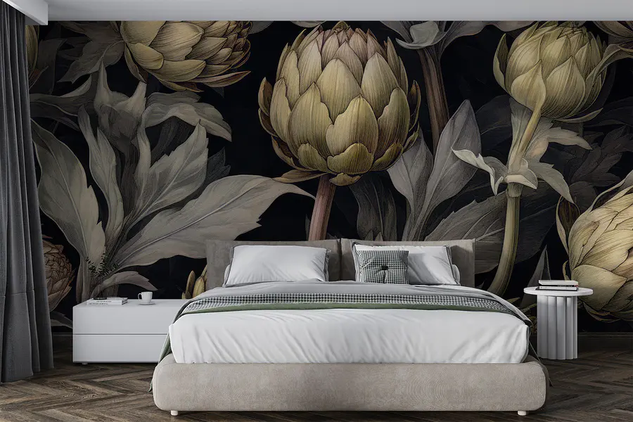 Przekształć każdy pokój w elegancką przystań dzięki tej fototapecie przedstawiającej karczochy i liście na efektownym czarnym tle. To jak przeniesienie kawałka ogrodu do wnętrza, bez konewki i uciążliwych owadów. Wyobraź sobie, że popijasz kawę, wpatrując się w te misterne karczochy o złotym odcieniu, które pięknie prezentują się na ciemnym płótnie. To z pewnością początek rozmowy – twoi goście z pewnością zrobią podwójne spojrzenie. Idealna do przytulnego kącika lub przestrzeni biurowej, która potrzebuje odrobiny stylu, ta fototapeta podnosi każdą ścianę swoim niepowtarzalnym urokiem. To małe dzieło sztuki, które opowiada historię – może nawet historię przyjęcia, na którym karczochy były gwiazdą!