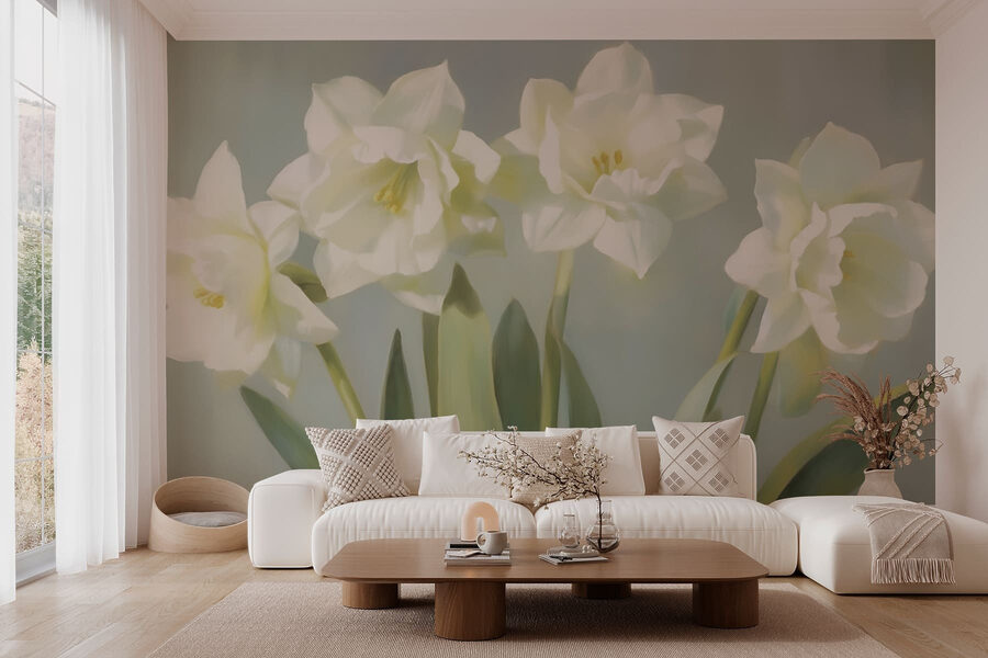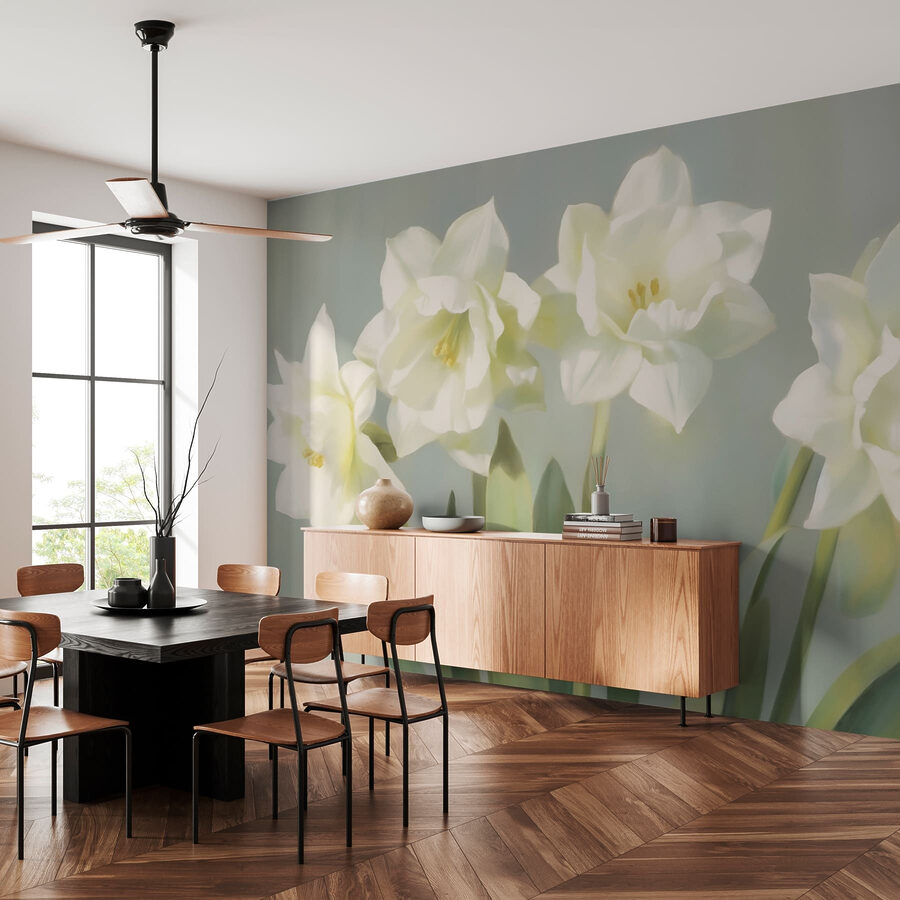 Odmień swoją przestrzeń dzięki tej czarującej fototapecie przedstawiającej grupę delikatnych białych kwiatów. Wyobraź sobie, że wchodzisz do pokoju wypełnionego delikatnym urokiem, który sprawia, że czujesz się, jakbyś wszedł do spokojnego ogrodu. Delikatne kolory tańczą jak szepty, tworząc atmosferę, która jest zarówno uspokajająca, jak i odświeżająca. Idealny do przytulnego kącika do czytania lub jasnego, przestronnego salonu, dodaje odrobinę ciepła, któremu trudno się oprzeć. Twoi goście mogą po prostu zatrzymać się i zastanowić, czy nie śnią, gdy go zobaczą. Piękny sposób na wprowadzenie odrobiny natury do swojego życia, bez konieczności posiadania zielonego kciuka!