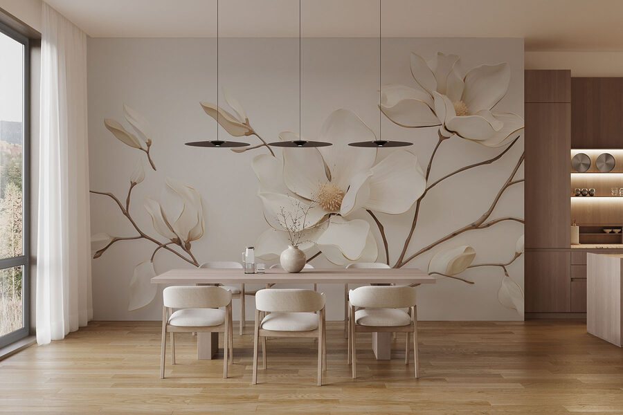 Przekształcenie pustej ściany w spokojną przestrzeń jest tak proste, jak ta oszałamiająca fototapeta z białymi kwiatami. Wyobraź to sobie – te wdzięczne kwiaty wyciągające się, niemal błagające o podziwianie. To jak zaproszenie natury do wnętrza bez uciążliwych pyłków! Gdy światło słoneczne tańczy po delikatnie pomalowanych płatkach, pokój wydaje się lżejszy, bardziej przewiewny – to powiew świeżego powietrza. Idealna do przytulnego salonu lub spokojnej sypialni, ta fototapeta to nie tylko dekoracja; opowiada historię elegancji i spokoju. Wyobraź sobie popijanie herbaty z przyjaciółmi, będąc otoczonym tą spokojną atmosferą. Piękno tkwi nie tylko w projekcie, ale także w tym, jak sprawia, że przestrzeń jest żywa, a jednocześnie spokojna. Dlaczego więc czekać? Niech ten mebel rozkwitnie w Twoim domu!