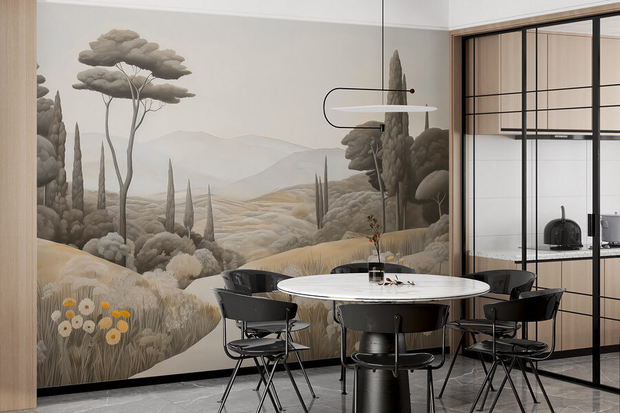 Odmień swoją przestrzeń dzięki tej oszałamiającej fototapecie ściennej “Krajobraz z krętą drogą i drzewami”. Ożywia ona spokojną wiejską okolicę, zapraszając naturę do wnętrza bez bałaganu na zewnątrz. Wyobraź sobie popijanie kawy w leniwą niedzielę, patrząc na łagodne wzgórza i kołyszące się drzewa – to jak mini-wakacje bezpośrednio na ścianie. Idealna na te senne chwile, ta fototapeta otula pokój ciepłymi, ziemistymi tonami i delikatnymi detalami, które sprawiają, że chce się głęboko oddychać. Szepcze relaks, przypominając o spokojnych spacerach pod gołym niebem. Wyobraź sobie rozmowy, które może wywołać lub spokojne wibracje, które przynosi – co za słodki akcent dla każdego zakątka!