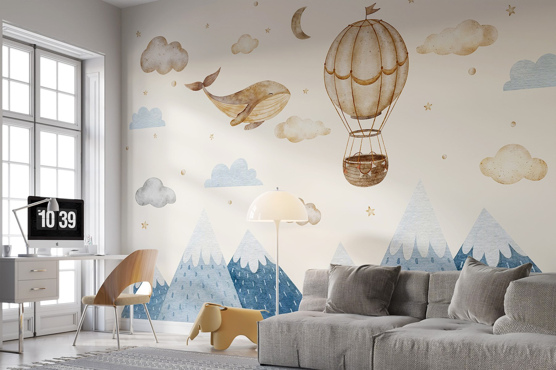 Wyobraź sobie, że wchodzisz do pokoju wypełnionego chmurami, gwiazdami i zabawnym wielorybem unoszącym się obok kapryśnego balonu na ogrzane powietrze. Ta fototapeta to nie tylko dekoracja; to przygoda, która czeka na to, by się wydarzyć! Wyobraź sobie dzieci z szeroko otwartymi oczami, wyobrażające sobie, że wyruszają w podniebną podróż, podczas gdy dorośli nie mogą powstrzymać się od uśmiechu na widok tej uroczej sceny. Kojąca paleta kolorów wprowadza spokojną atmosferę – idealną do sypialni lub przytulnych zakątków. Niezależnie od tego, czy marzysz, pozwalasz myślom dryfować, czy po prostu łapiesz chwilę spokoju, ta fototapeta dodaje wyjątkowego akcentu, który jest zarówno magiczny, jak i zabawny. Idealna do pobudzenia wyobraźni!