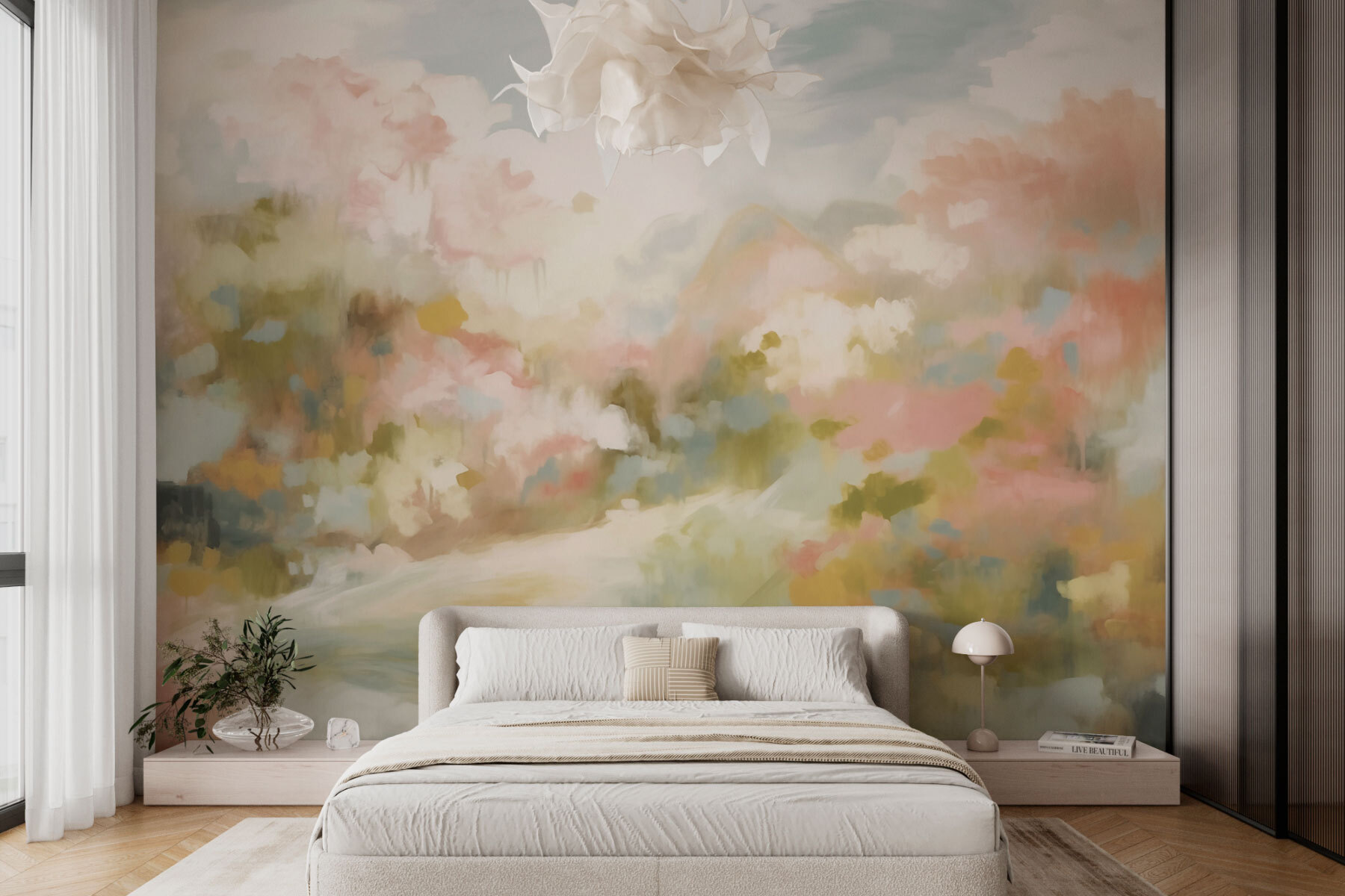 Wyobraź sobie, że wchodzisz do spokojnego krajobrazu za każdym razem, gdy wchodzisz do pokoju. Ta fototapeta ścienna przenosi piękno natury bezpośrednio na ściany, przekształcając przestrzeń w spokojną ucieczkę. Delikatne pastelowe odcienie wirują razem, przywołując na myśl kwitnące ogrody i odległe góry. To tak, jakby natura przytuliła twój dom! Idealna do każdej przestrzeni – czy to przytulnego salonu, czy spokojnej sypialni – fototapeta dodaje odrobinę uspokajającego koloru i uroku. Przyjaciele będą mogli odpłynąć w marzenia o słonecznych spacerach, a kto nie chciałby odrobiny słodyczy w swoim codziennym życiu?