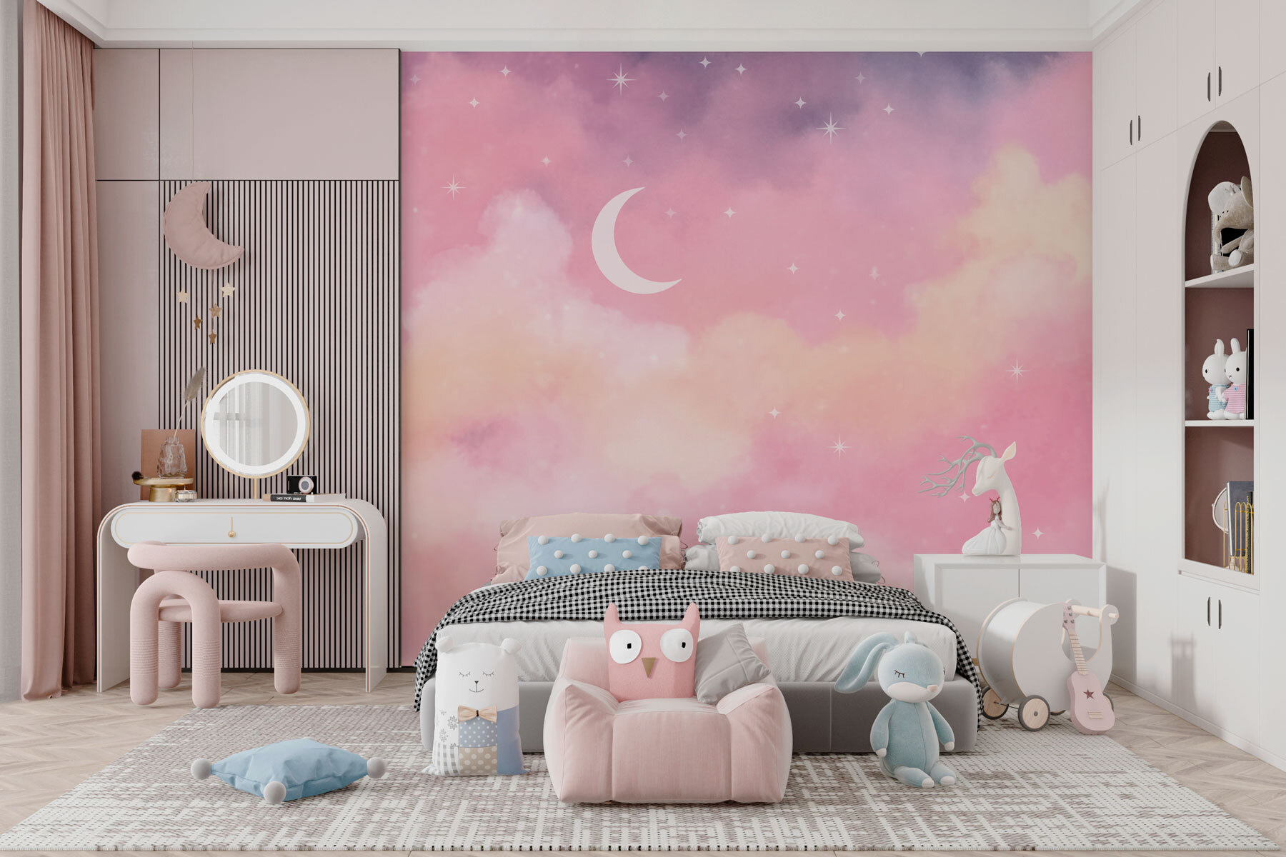Przekształć pokój dziecka w senne nocne niebo dzięki tej czarującej fototapecie z miękkimi różowymi odcieniami, delikatnymi gwiazdami i łagodnym półksiężycem. Wyobraź sobie bajki na dobranoc rozgrywające się pod rozgwieżdżonym sufitem, gdzie każde spojrzenie inspiruje do zachwytu. Idealny do rozpalania marzeń o przygodzie i eksploracji, tworzy spokojny nastrój, zamieniając każdą przestrzeń w przytulne schronienie. To jak przeniesienie kawałka wszechświata do wnętrza – idealne do odpłynięcia lub przytulenia się z dobrą książką. Wyobraź sobie te zaspane oczy, które rozjaśniają się, gdy widzą tę magiczną scenę!