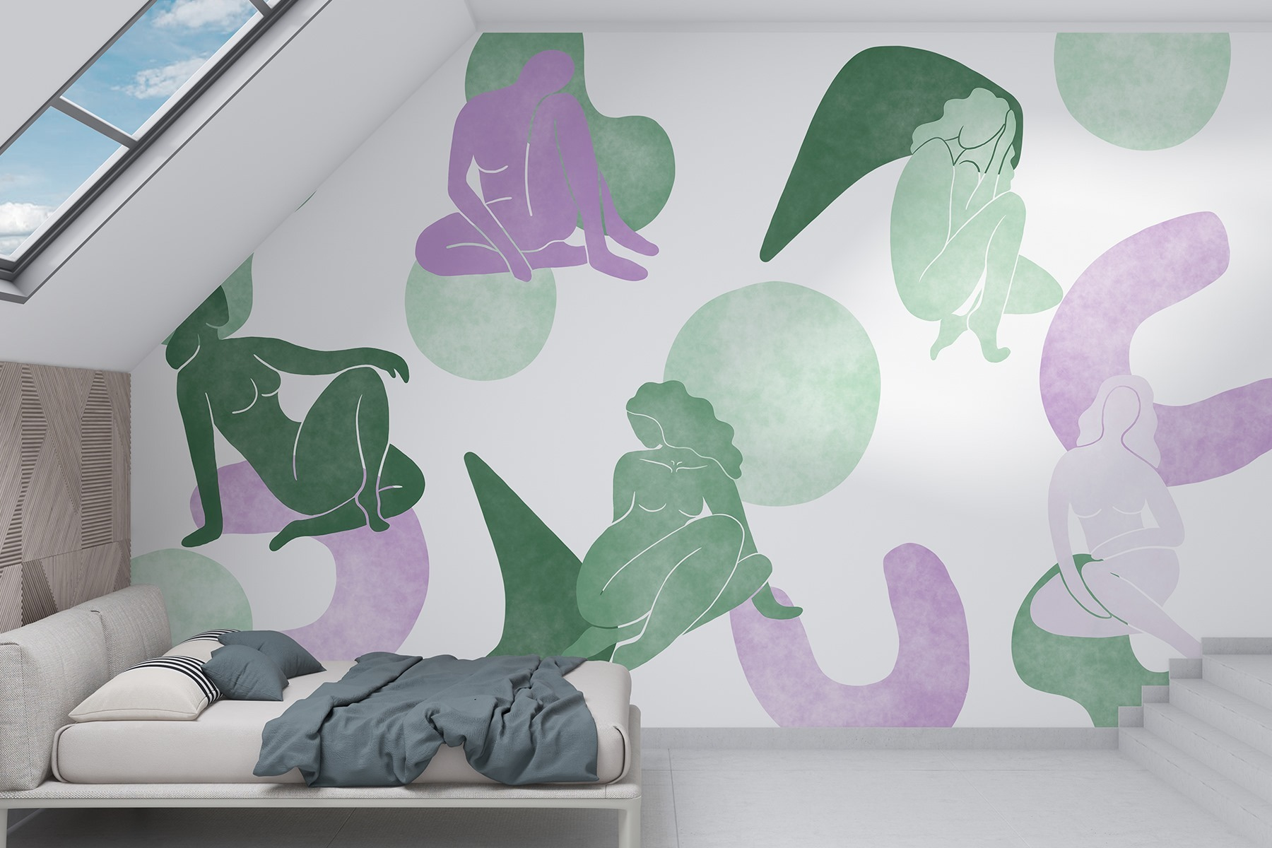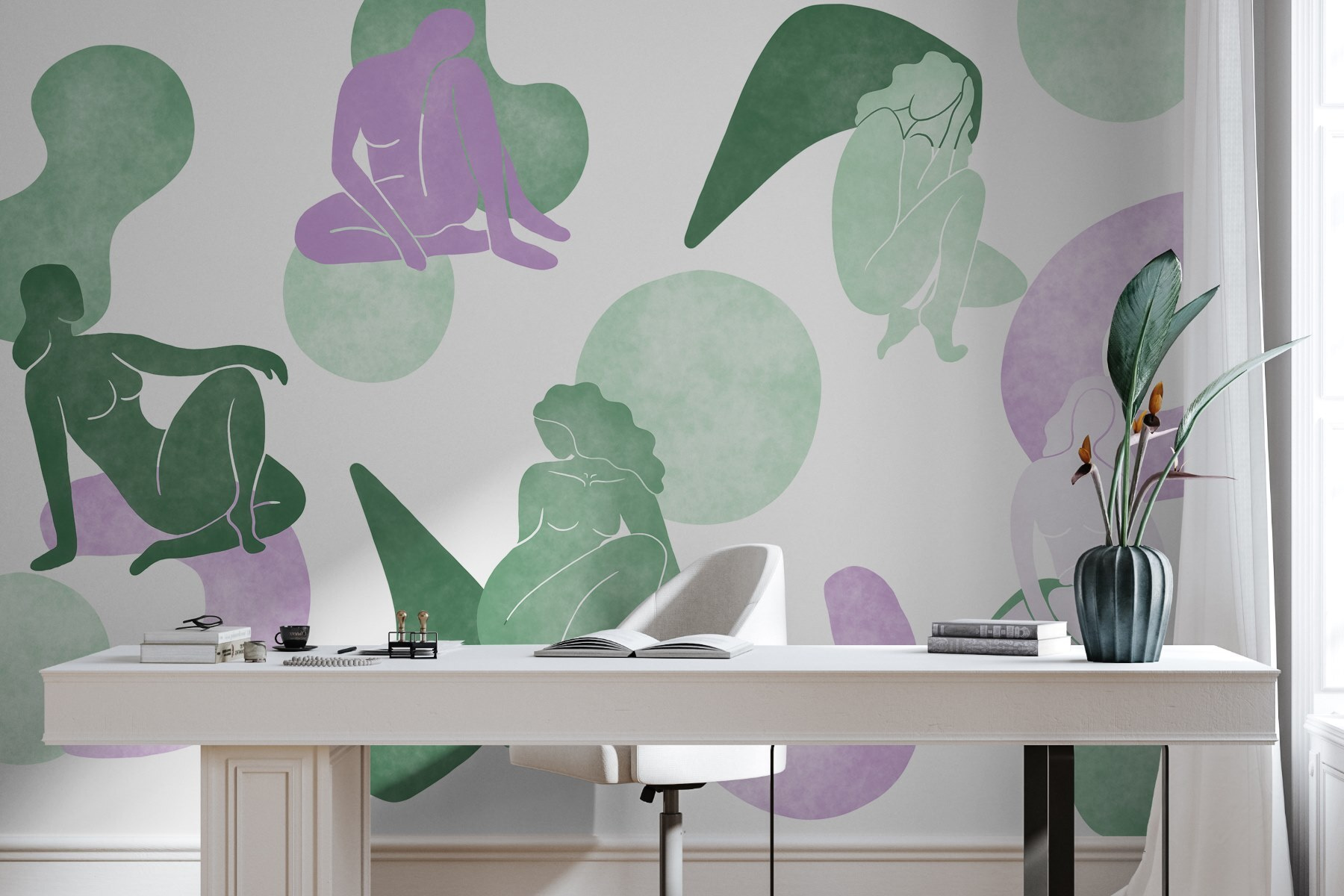 Delikatne odcienie zieleni i lawendy łączą się bez wysiłku, tworząc kojące tło, które uzupełnia różne style wystroju. Jest idealny do przytulnego kącika do czytania lub artystycznego salonu! Wystarczy wyobrazić sobie, jak wywoła rozmowy, gdy wpadną goście. To coś więcej niż zwykła tapeta; to jak powieszenie dzieła sztuki, które przemawia do serca. Dodaj tę fototapetę, a następnie obserwuj, jak twoja przestrzeń przekształca się w oazę stylu i komfortu.