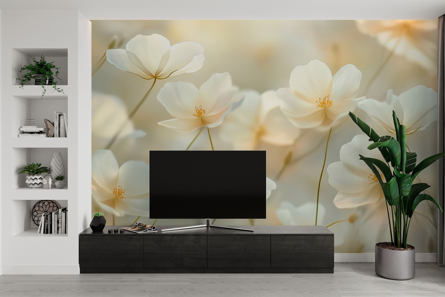 Odmień każdą przestrzeń dzięki tej pięknej fototapecie z delikatną grupą białych kwiatów. Wyobraź sobie, że wchodzisz do pokoju i od razu czujesz się spokojniej, jakbyś spacerował po spokojnym ogrodzie. Delikatne odcienie i wdzięczne kwiaty dodają elegancji bez przytłaczania. To tak, jakby mieć wiosnę w domu, bez konieczności podlewania! Idealna do przytulnego kącika do czytania lub jasnej jadalni, ta fototapeta zaprasza do ciepła i spokoju. Znajomi z pewnością będą pytać, gdzie znalazłeś tak uroczy element. Chodzi o te małe szczegóły, które robią wielką różnicę. Podnieś swój wystrój tylko odrobinę – bo kto nie potrzebuje odrobiny kwiatowej magii?