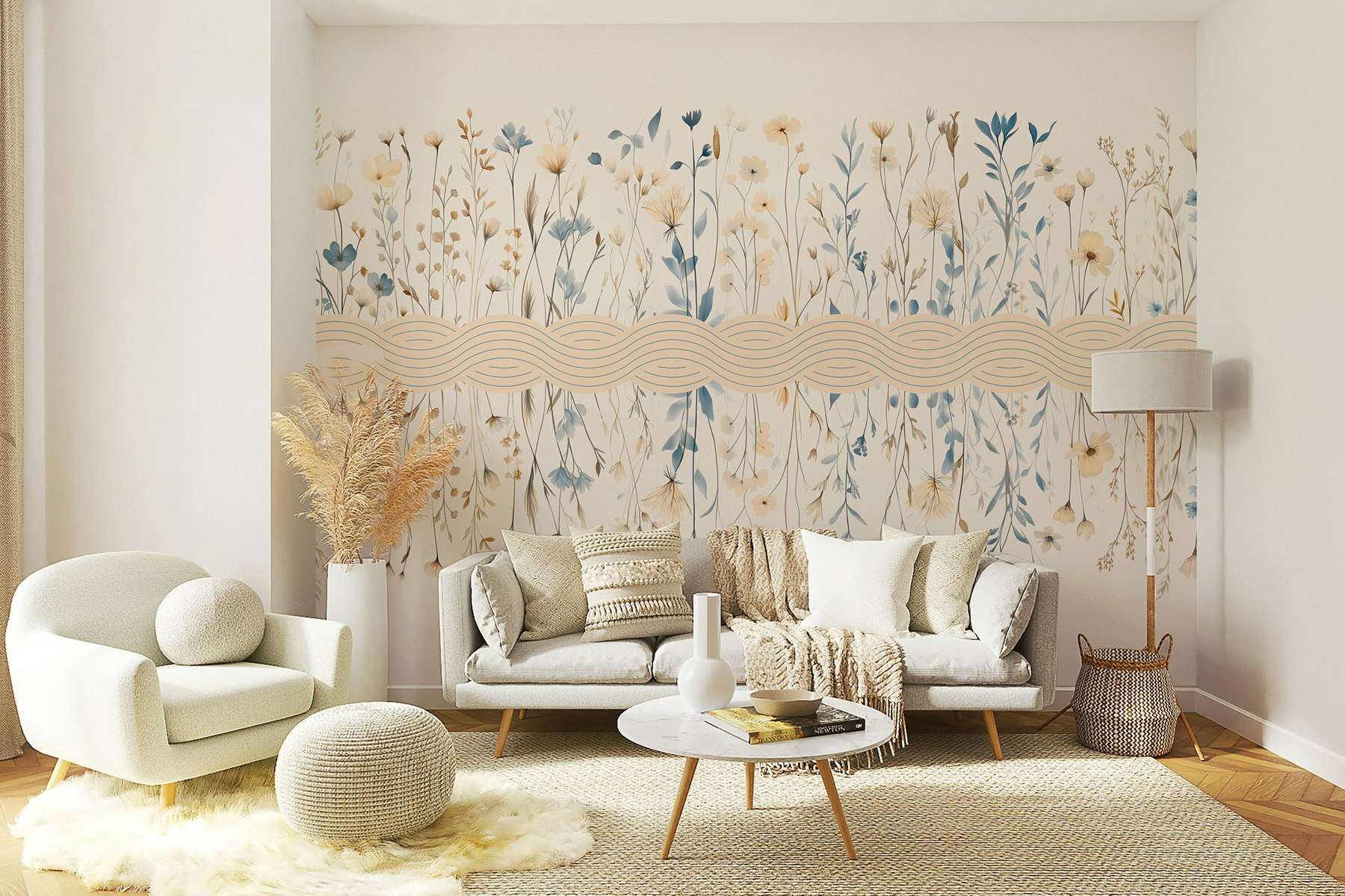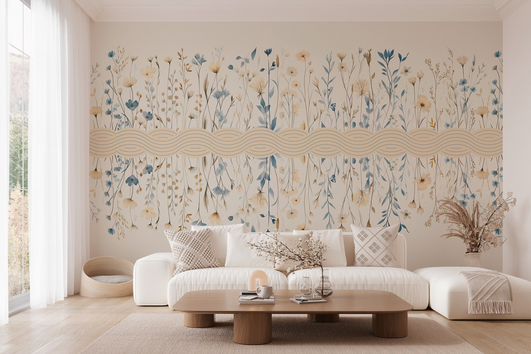 Przekształć dowolną przestrzeń w spokojną ucieczkę dzięki tej zachwycającej fototapecie ściennej z kwiatowym wzorem w uroczych błękitach i delikatnych bielach. Wyobraź sobie, że wchodzisz do pokoju, w którym delikatne kwiaty kołyszą się delikatnie, przynosząc wybuchy spokoju i radości. Kojąca paleta kolorów przywołuje uczucie relaksu, niczym wietrzny dzień spędzony na wędrówce po cichym ogrodzie. Idealna do przytulnego salonu lub spokojnej sypialni, ta fototapeta wnosi urok i kaprys. Czas porzucić gładkie ściany i wprowadzić odrobinę kwiatowej magii – twoje ściany zasługują na ulepszenie. Ponadto, to jak posiadanie ogrodu, który nigdy nie więdnie!