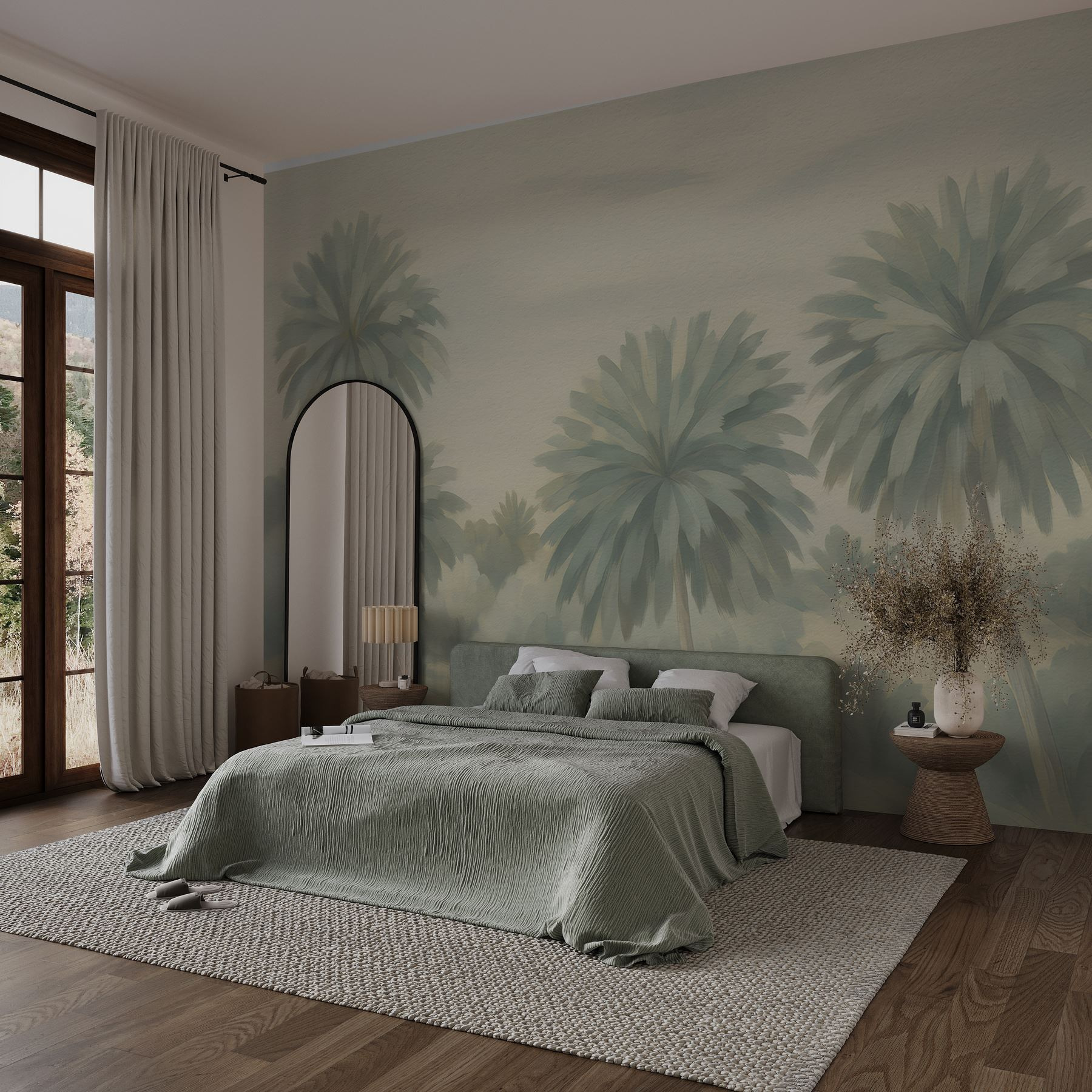 Przekształć dowolny pokój w tropikalną oazę dzięki tej oszałamiającej fototapecie z palmami. To jak przeniesienie kawałka raju do wnętrza, bez ryzyka poparzenia słonecznego. Wyobraź sobie: popijasz poranną kawę, patrząc na te łagodne olbrzymy kołyszące się na delikatnej bryzie. Stonowane odcienie tworzą spokojne tło, idealne do relaksu. Idealna do salonów, sypialni, a nawet przytulnych kącików do czytania, dodaje odrobinę natury bez konieczności utrzymywania prawdziwych roślin. Ta fototapeta zachęca do marzeń o piaszczystych plażach i ciepłej bryzie. Kto by tego nie pokochał?