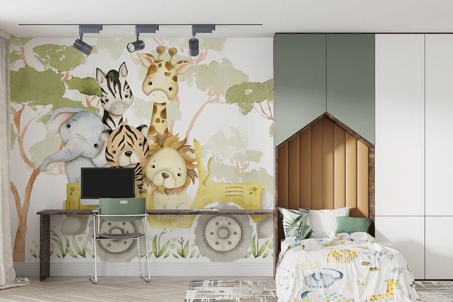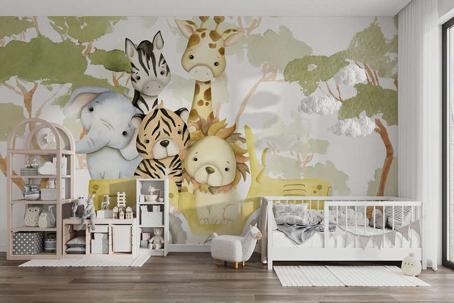 Wyobraź sobie: wchodzisz do pokoju, a te urocze stworzenia witają cię swoimi ciekawskimi wyrazami twarzy. To tak, jakby zapraszały cię do przyłączenia się do ich małej eskapady! Akwarelowy styl daje delikatny, uspokajający nastrój – to prawie jak scena z bajki rozgrywająca się w twoim domu. Tak więc, niezależnie od tego, czy przekształcasz pokój dziecięcy, czy po prostu chcesz odrobiny kaprysu w swoim życiu, ta fototapeta jest dla ciebie.