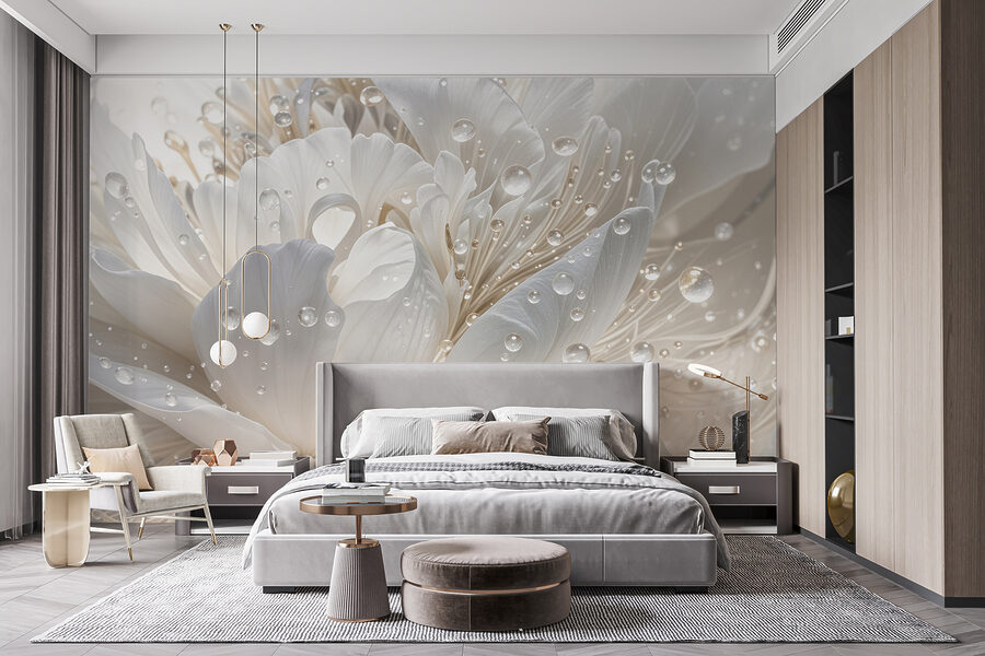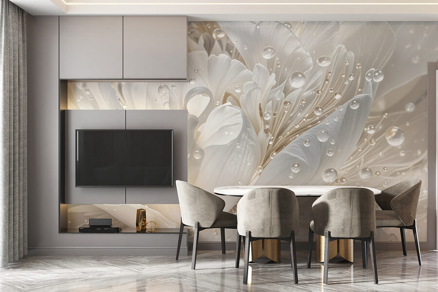 Wyobraź sobie, że wchodzisz do pokoju, w którym pocałowane rosą płatki mienią się w słońcu, prawie jak sekretny ogród we wnętrzu. Ta fototapeta to nie tylko dekoracja ścienna – to poprawiacz nastroju. Idealna dla tych, którzy widzą piękno w małych rzeczach, takich jak krople deszczu przylegające do kwiatów. Możesz popijać kawę, wpatrując się w nią i czując, jak ogarnia cię spokój. To delikatny szept natury, który pomaga przestrzeniom – dużym i małym – rozkwitać ciepłem i magią. To także świetny początek rozmowy!