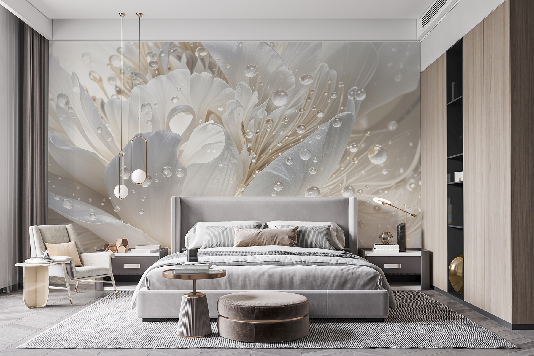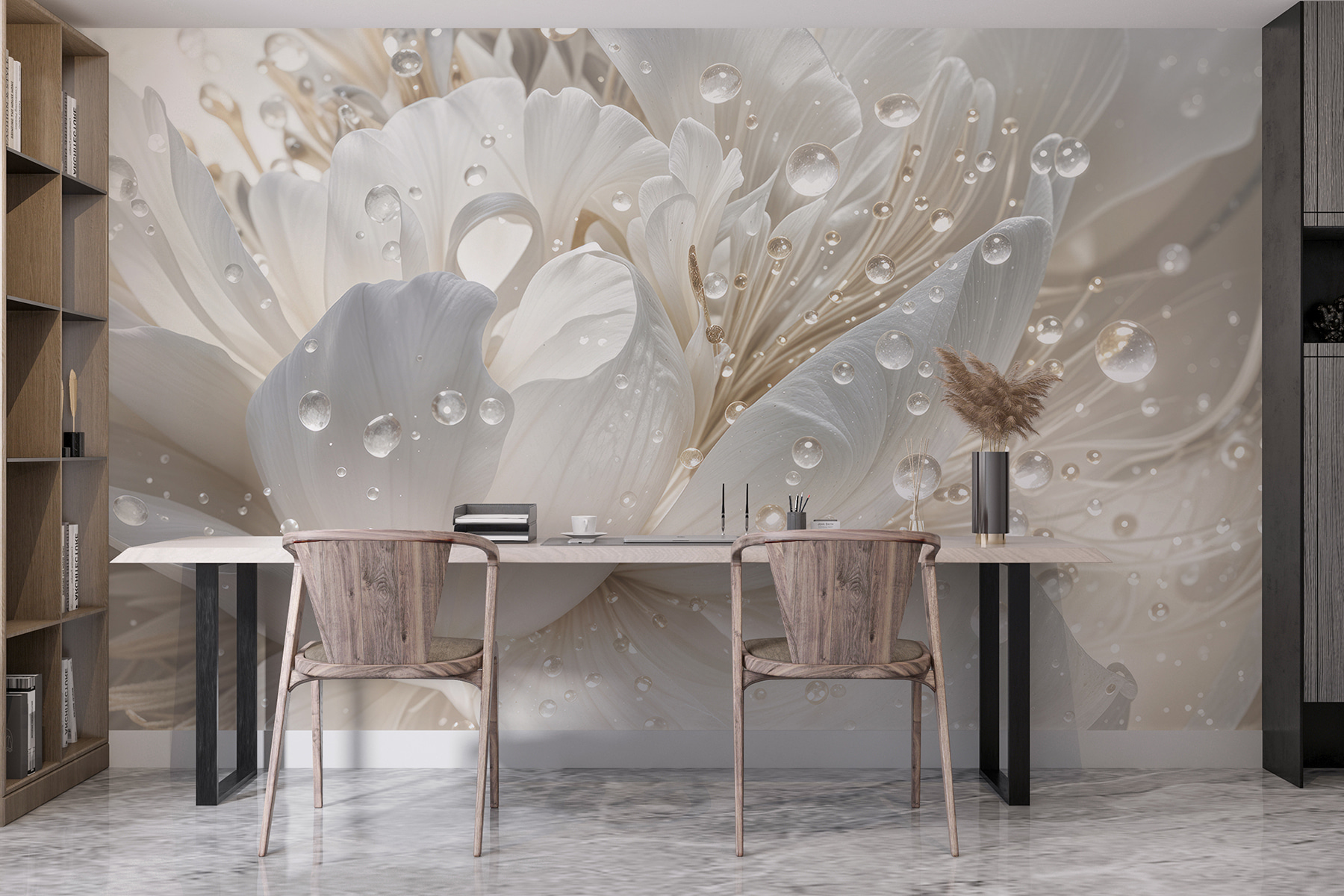 Wyobraź sobie, że wchodzisz do pokoju, w którym pocałowane rosą płatki mienią się w słońcu, prawie jak sekretny ogród we wnętrzu. Ta fototapeta to nie tylko dekoracja ścienna – to poprawiacz nastroju. Idealna dla tych, którzy widzą piękno w małych rzeczach, takich jak krople deszczu przylegające do kwiatów. Możesz popijać kawę, wpatrując się w nią i czując, jak ogarnia cię spokój. To delikatny szept natury, który pomaga przestrzeniom – dużym i małym – rozkwitać ciepłem i magią. To także świetny początek rozmowy!