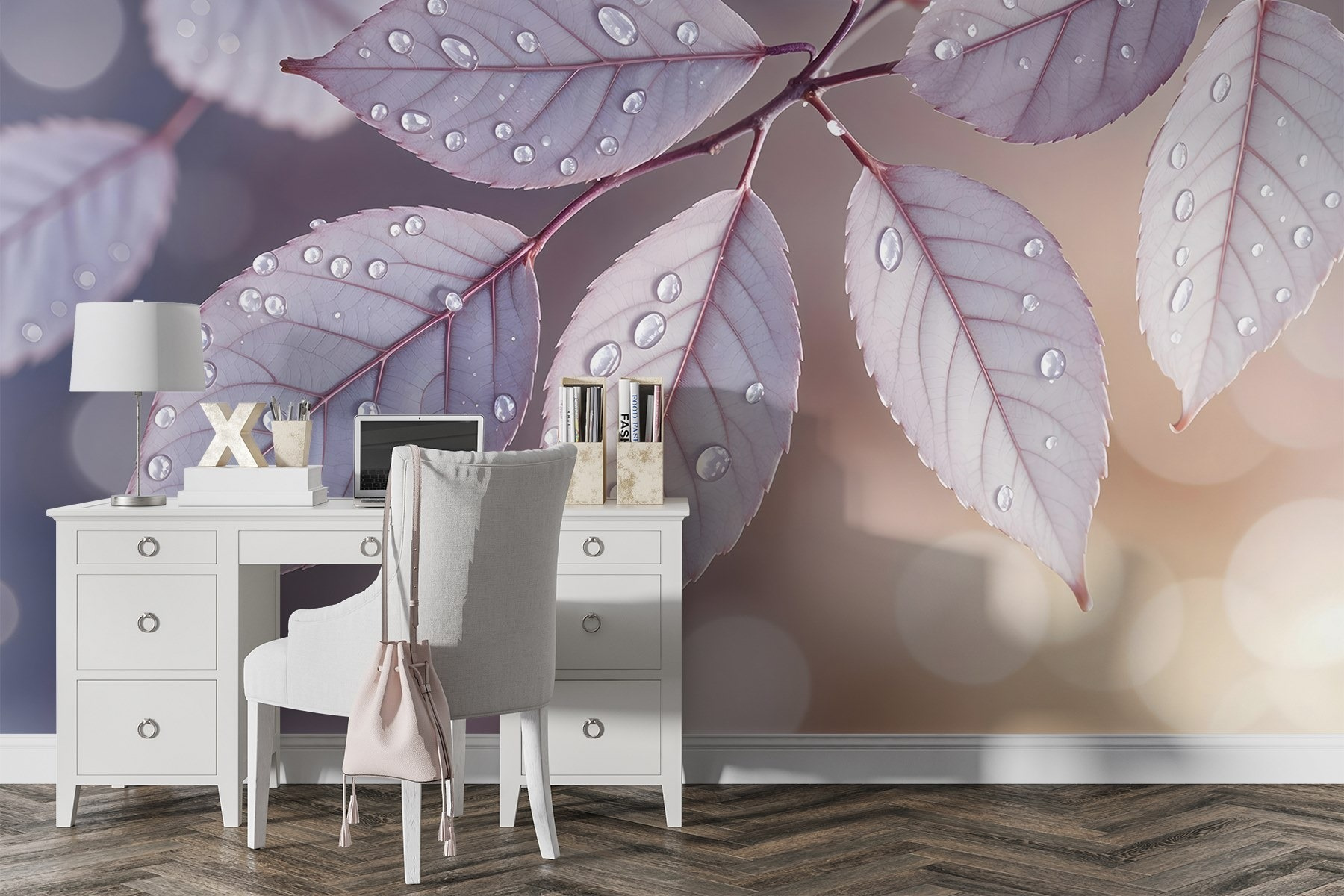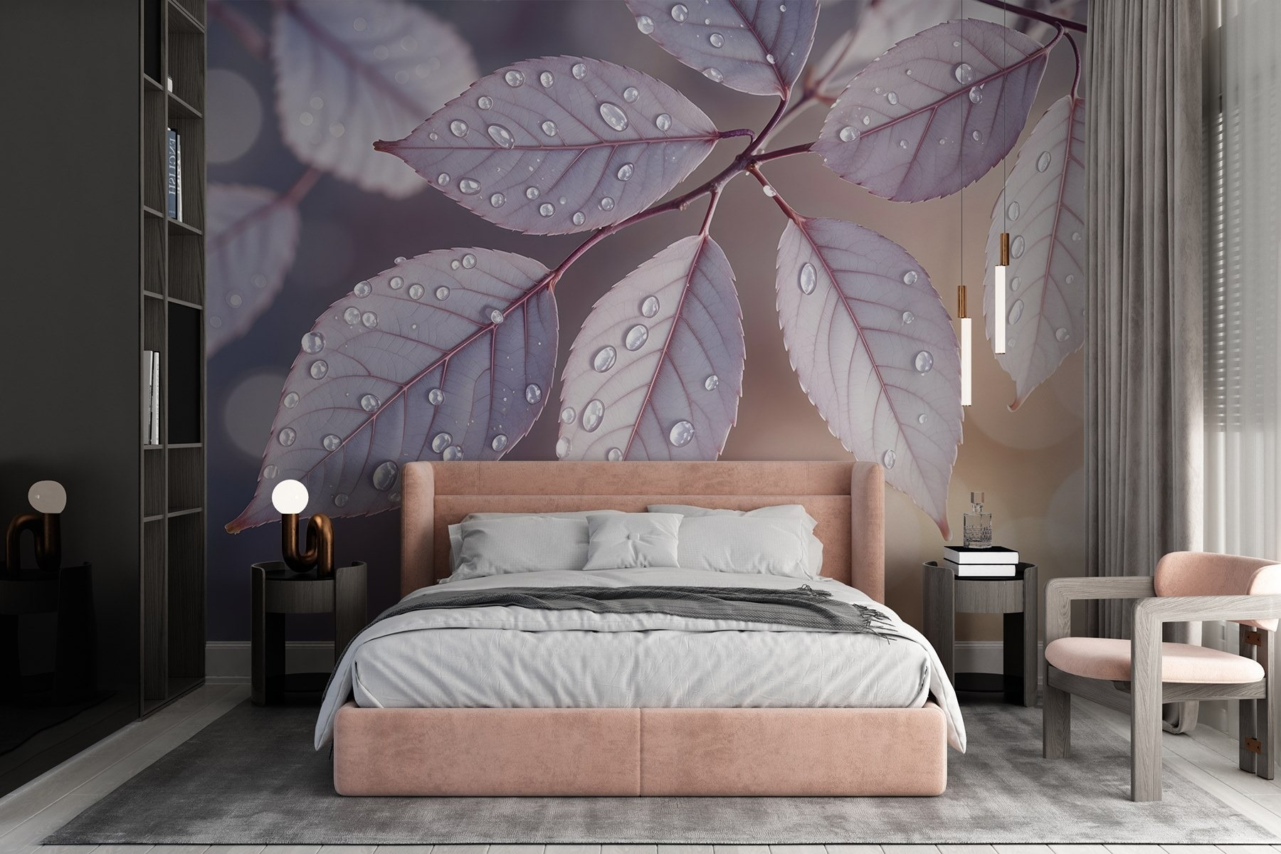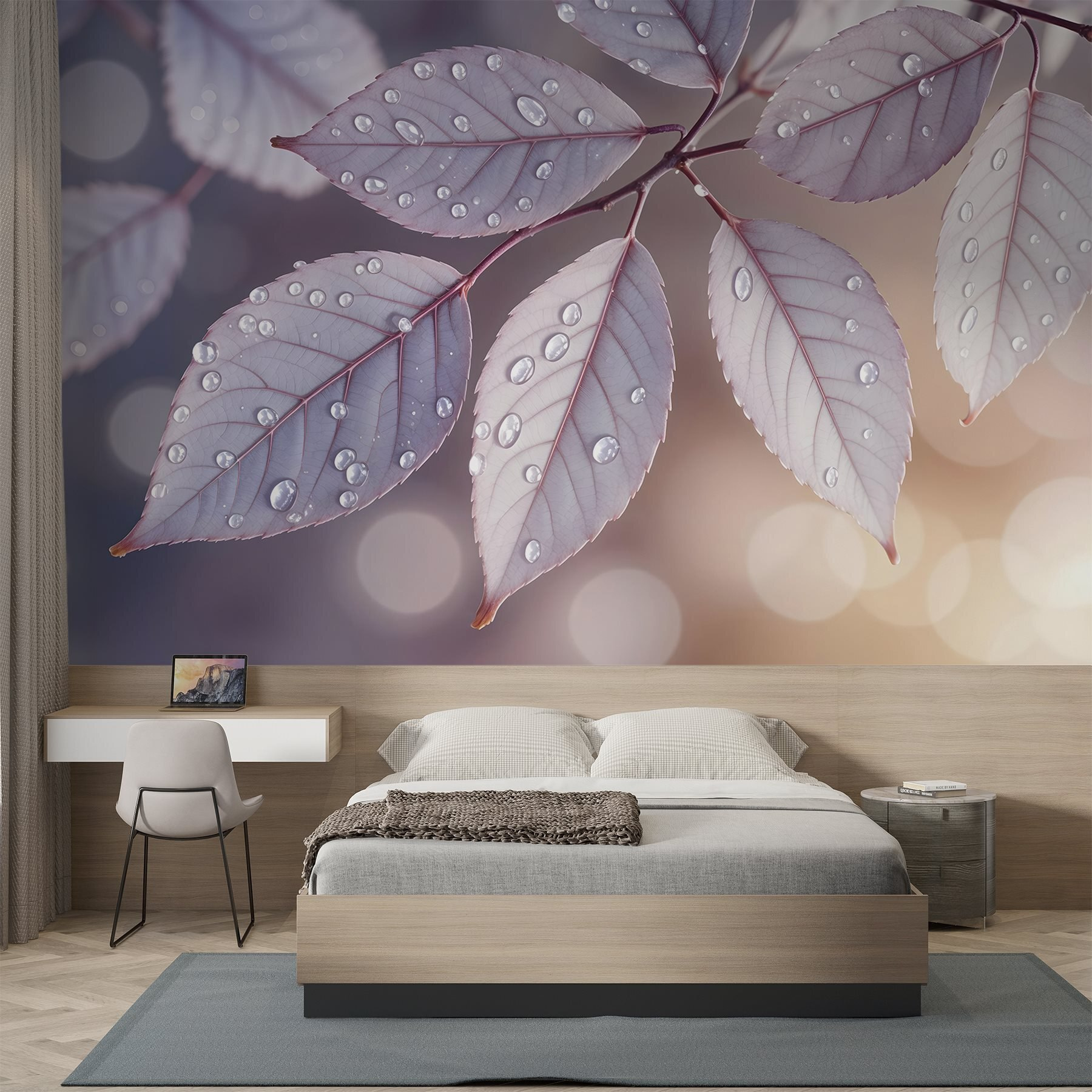 Odmień swoją przestrzeń dzięki tej oszałamiającej fototapecie przedstawiającej delikatne liście ozdobione kroplami deszczu. To jak przeniesienie kawałka natury do wnętrza, bez zabłoconych butów! Wyobraź sobie, że wchodzisz do swojego pokoju i bum! Codziennie wita cię ta uspokajająca scena. Delikatny efekt akwareli dodaje marzycielskiego charakteru, tworząc uczucie, które jest zarówno spokojne, jak i orzeźwiające.