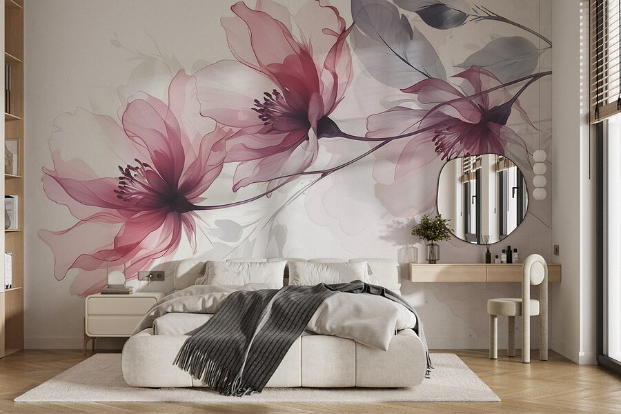 Odmień swoją przestrzeń dzięki “Delicate Blooms in Soft Hues”. Wyobraź sobie, że wchodzisz do spokojnego japońskiego ogrodu, w którym piwonie delikatnie tańczą na wietrze – ta fototapeta przenosi ten spokój wprost na twoją ścianę. Delikatne róże i subtelne zielenie tworzą atmosferę, która jest zarówno świeża, jak i spokojna.