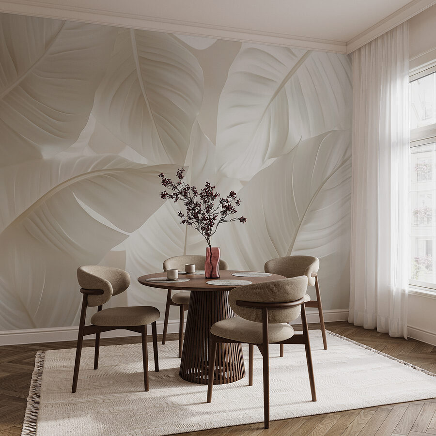 Przekształcanie przestrzeni może przypominać mini-wakacje, a ta fototapeta z delikatnymi, eleganckimi wzorami liści jest tutaj, aby przenieść Cię do spokojnej tropikalnej ucieczki. Wyobraź sobie, że wchodzisz do pokoju i czujesz natychmiastowy spokój, jak powiew świeżego powietrza. Te delikatne wzory liści szepczą relaks, idealne do przytulnego kącika do czytania lub tętniącego życiem salonu. Niezależnie od tego, czy jest słoneczny, czy deszczowy dzień, ta fototapeta tworzy ciepłą, zachęcającą atmosferę. W ten sposób natura mówi: “Zostań chwilę, rozprostuj nogi”. Chwyć więc filiżankę herbaty, pozwól liściastym wibracjom zadomowić się i ciesz się pięknem!