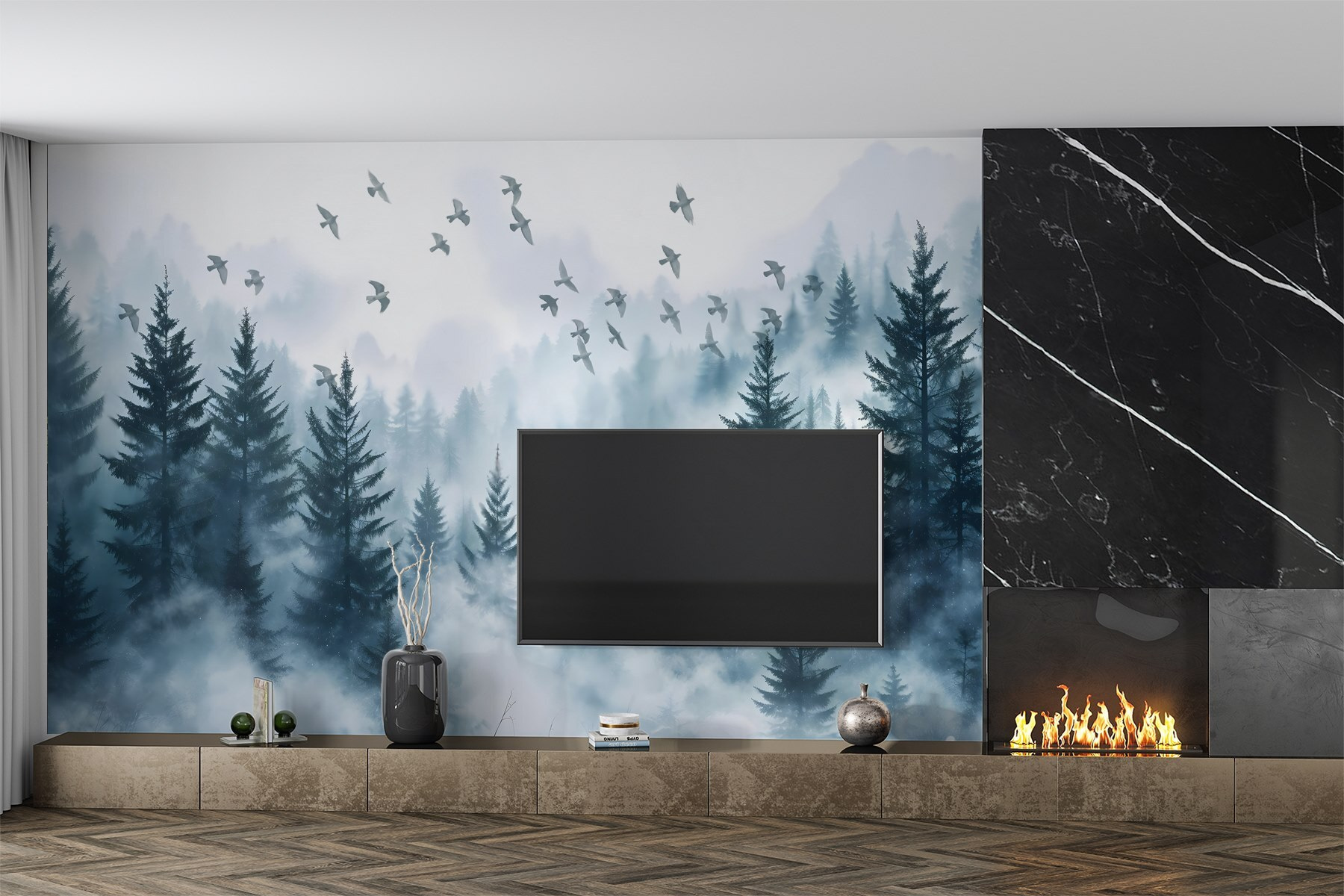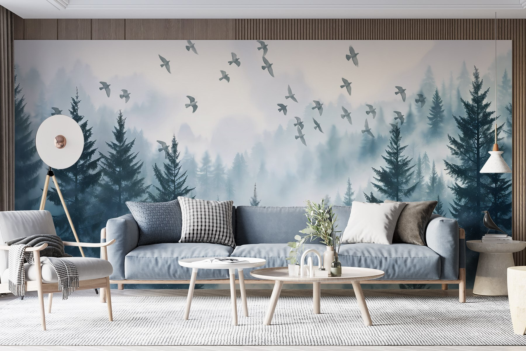 Przekształć swoją przestrzeń za pomocą fototapety ściennej “Ptaki latające nad lasem” – spokojna ucieczka bezpośrednio w salonie. Wyobraź sobie, że wchodzisz i witasz się z mglistym lasem, w którym ptaki latają między wysokimi drzewami. To jak wejście do sennej bajki!