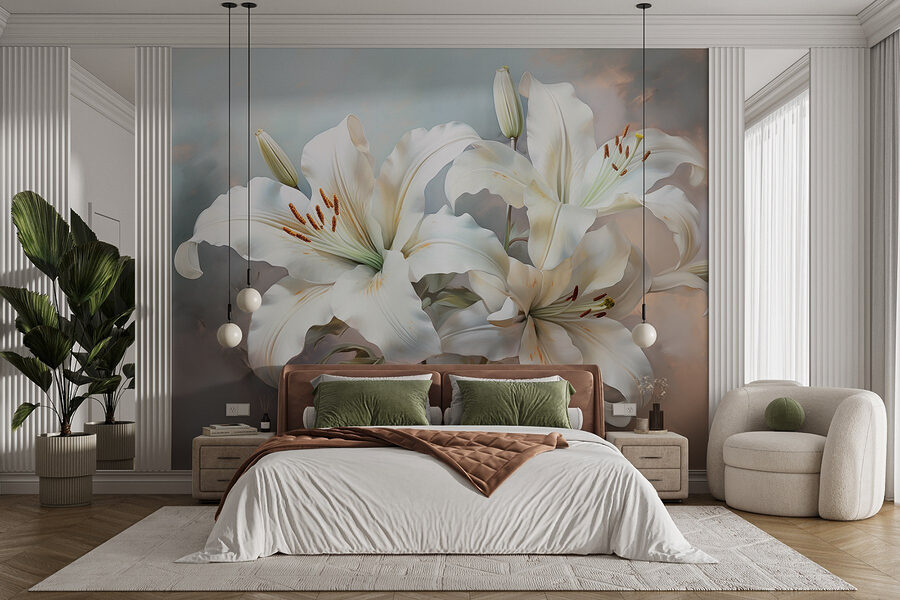 Przekształć swoją przestrzeń w spokojne miejsce z fototapetą ścienną “Delicate Lilies in Soft Hues”. Wyobraź sobie, że wchodzisz do pokoju, w którym witają cię miękkie, płynące lilie, szepcząc elegancję. Delikatne kolory są jak przytulny uścisk, idealny do rozjaśnienia tego małego kącika, w którym popijasz poranną kawę lub relaksujesz się po długim dniu. Każdy uwielbia dobre opowieści o kwiatach, a te lilie mogą po prostu zainspirować marzenia o wiosennych piknikach i leniwych popołudniach. Dodaj tę fototapetę i obserwuj, jak zmienia się atmosfera – pokój wydaje się lżejszy, bardziej zachęcający. To jak posiadanie ogrodu, który nigdy nie więdnie.