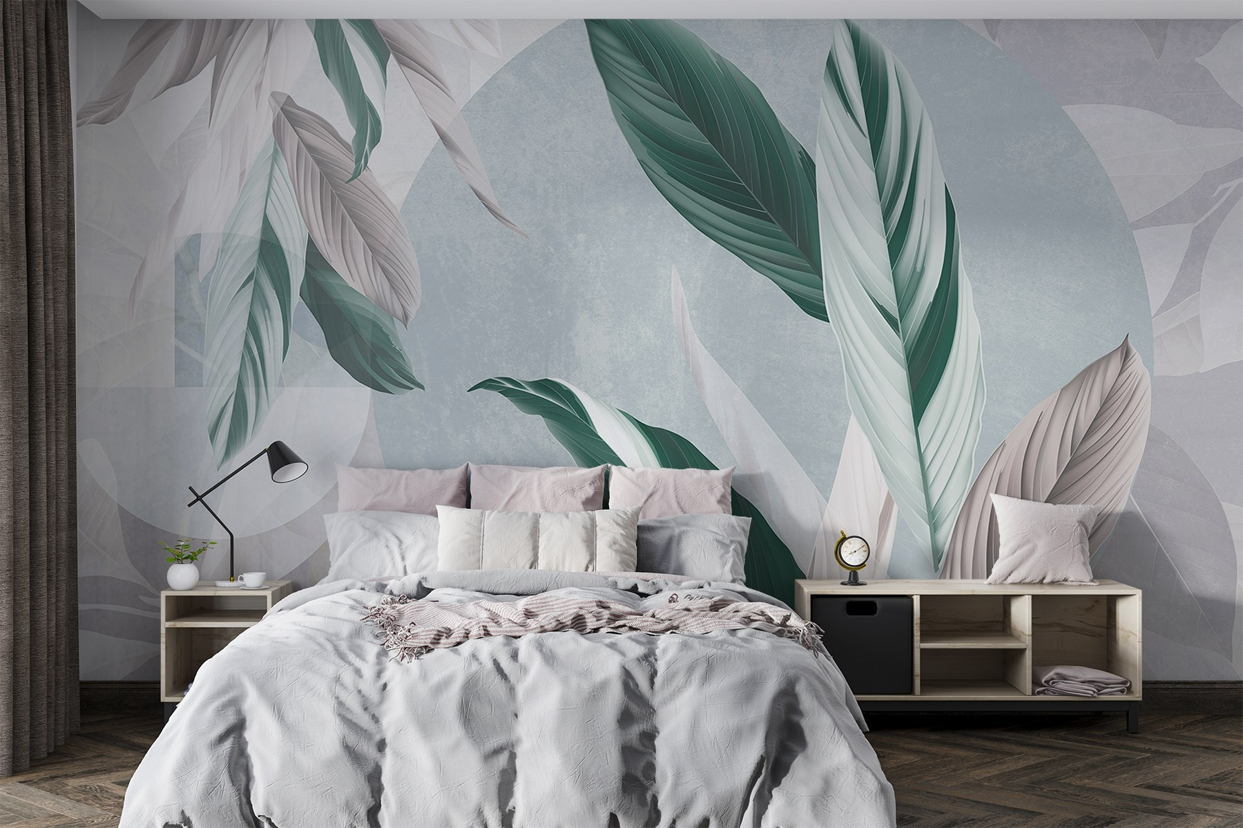 Zmień swoje wnętrze dzięki „Delikatnym wzorom liści natury”. Delikatne odcienie i eleganckie wzory liści tej fototapety wprowadzają spokojną atmosferę, sprawiając, że każde pomieszczenie staje się przytulnym ogrodowym zaciszem. Wyobraź sobie, że popijasz herbatę, wpatrując się w te uspokajające wzory – to jak mini wakacje we własnym domu! Delikatne odcienie zieleni i szarości pasują niemal wszędzie, dodając odrobinę natury bez konieczności pielęgnacji (żegnajcie, konewki!). Idealna do kącika do czytania, a nawet do tętniącego życiem salonu, przypomina, że piękno może być zarówno proste, jak i oszałamiające. Kto nie chciałby mieć takiego naturalnego uroku?