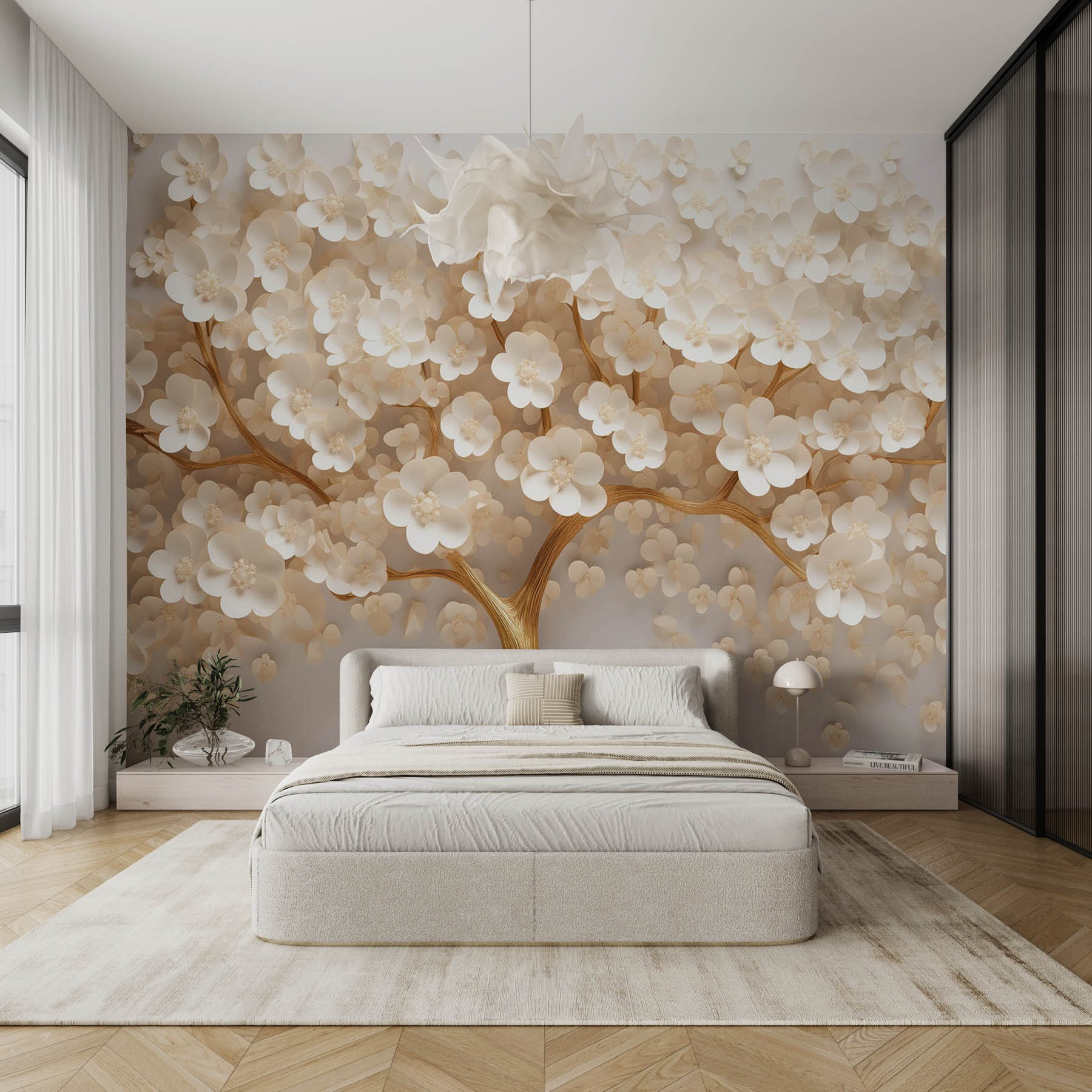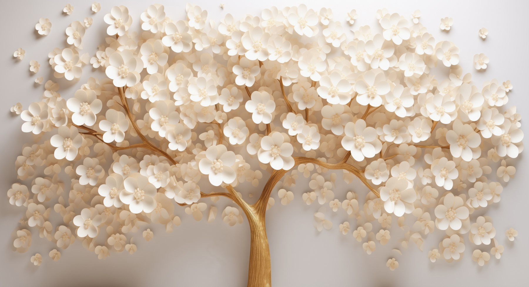 Wkrocz do spokojnego raju dzięki tej czarującej fototapecie „Drzewo z białymi kwiatami”. Wyobraź sobie delikatne drzewo pełne kwiatów, które zamienia każdą przestrzeń w spokojną przystań. Miękkie, kremowe płatki i mocne gałęzie tworzą delikatny kontrast, który jest po prostu uroczy. To jak mieć wiosnę w domu przez cały rok – ale bez alergii!