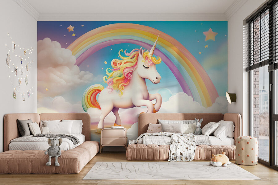 Zmień każde pomieszczenie w bajkową krainę dzięki tej czarującej fototapecie przedstawiającej wesołą jednorożca skaczącą po chmurach pod kolorową tęczą! To jak niekończąca się zabawa w marzeniach, idealna do pobudzenia wyobraźni. Dzieci (i, szczerze mówiąc, dorośli również) pokochają tę magiczną atmosferę. Wyobraź sobie czytanie bajek wypełnione śmiechem lub przytulną przestrzeń, w której swobodnie płynie kreatywność. Delikatne kolory tej fototapety stanowią urocze tło — uspokajające, a jednocześnie ekscytujące, dzięki czemu idealnie nadaje się do pokoju zabaw lub pokoju dziecięcego. Kto nie chciałby budzić się każdego ranka w otoczeniu odrobiny magii?