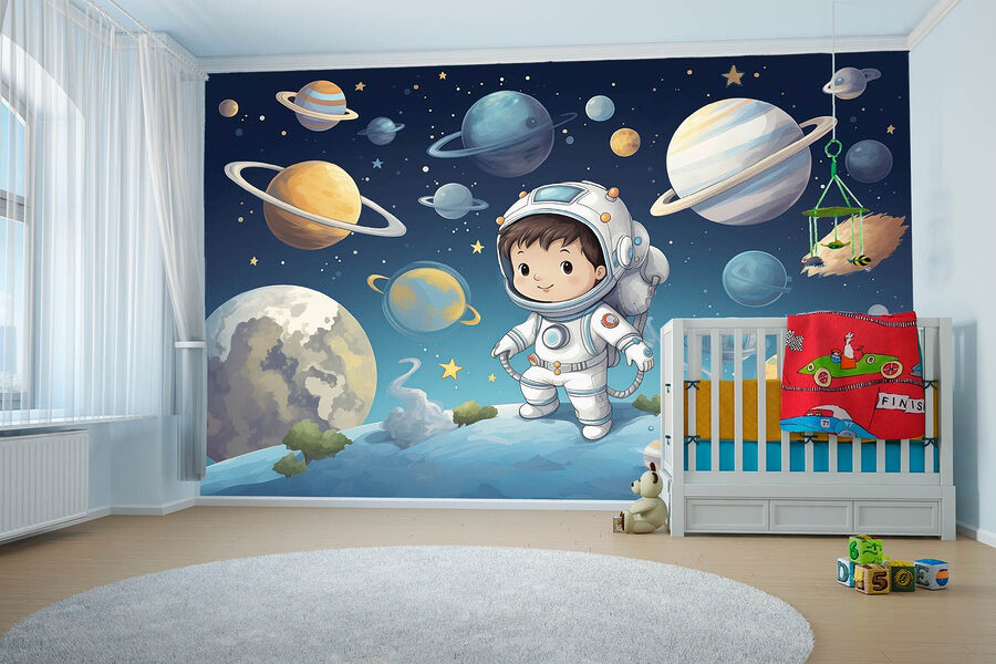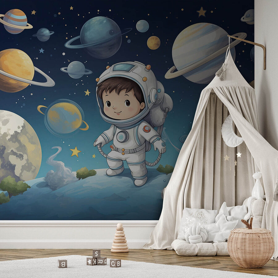 Wyrusz w kosmiczną przygodę dzięki tej uroczej fototapecie przedstawiającej uroczego chłopca w skafandrze kosmicznym! Wyobraź sobie pokój zamieniony w kosmiczny plac zabaw, gdzie wyobraźnia może wzbić się wyżej niż pierścienie Saturna. Żywe kolory oddają czarujące piękno galaktyki. Maluchy mogą marzyć o wielkich rzeczach, unosząc się wśród planet i gwiazd, które budzą ciekawość i radość! Niezależnie od tego, czy jest to pokój dziecięcy, czy pokój zabaw, ta fototapeta dodaje fantazji i odrobinę kosmicznej magii. Kto nie chciałby gonić meteorów, chrupiąc przekąski? To tak, jakby mieć na ścianie małego astronautę gotowego do międzygwiezdnej zabawy!