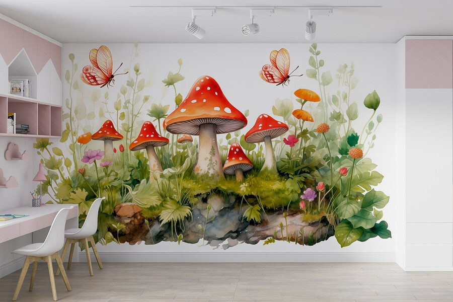 Odmień swoją przestrzeń dzięki tej czarującej fototapecie ściennej z uroczymi grzybami i delikatnymi motylami. Wyobraź sobie, że wchodzisz do pokoju, w którym kaprys natury tańczy wokół ciebie. Żywe czerwone kapelusze grzybów wyskakują jak cukierki w lesie, podczas gdy delikatne pastelowe kwiaty wyglądają przez bujną zieleń. A te motyle? Czysta magia, przelatujące przez scenę, jakby miały gdzieś specjalne miejsce. To jak przeniesienie fragmentu bajki do domu, zapraszając do zatrzymania się i docenienia małych cudów życia. Ta fototapeta nie tylko zdobi – ona tryska radością! Idealna do przytulnego kącika, pokoju dziecięcego lub dowolnego miejsca, w którym przydałaby się odrobina radości.