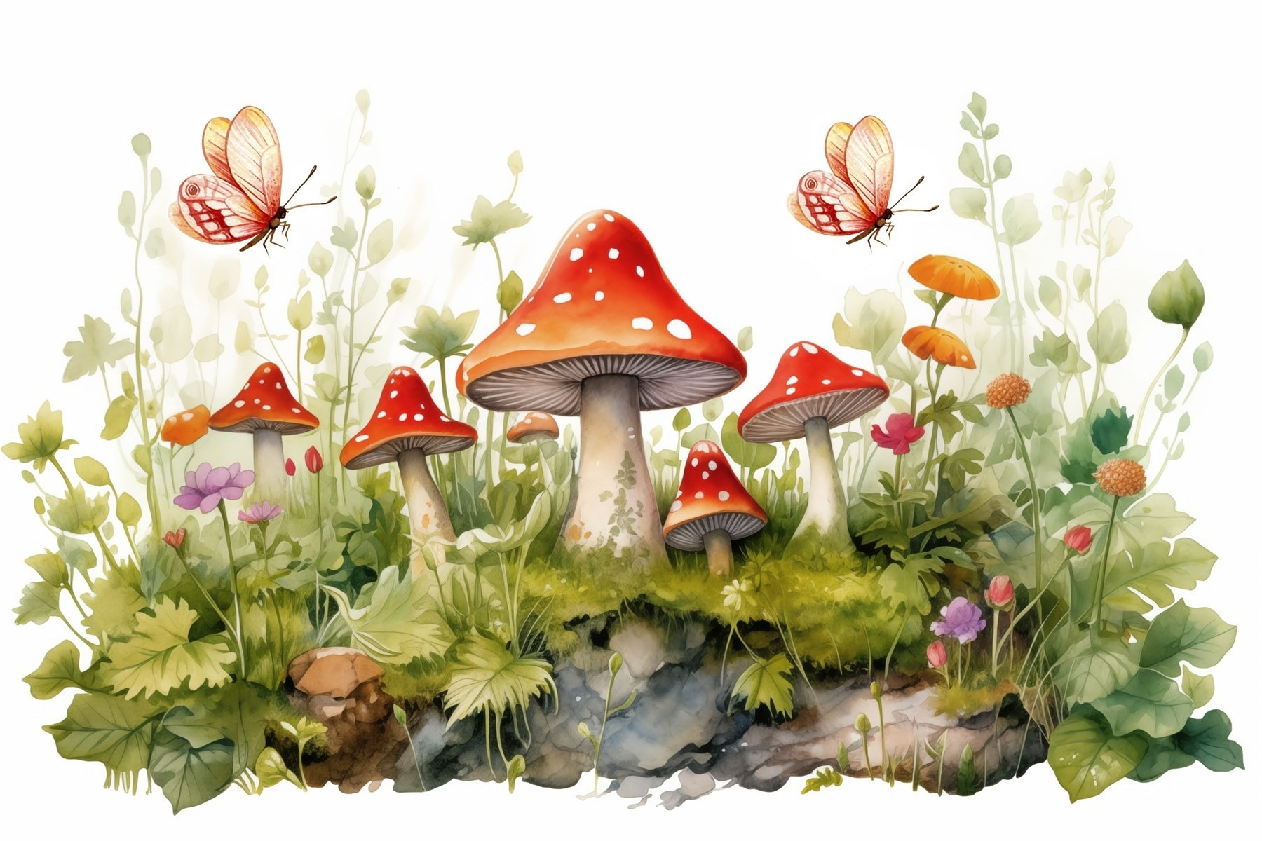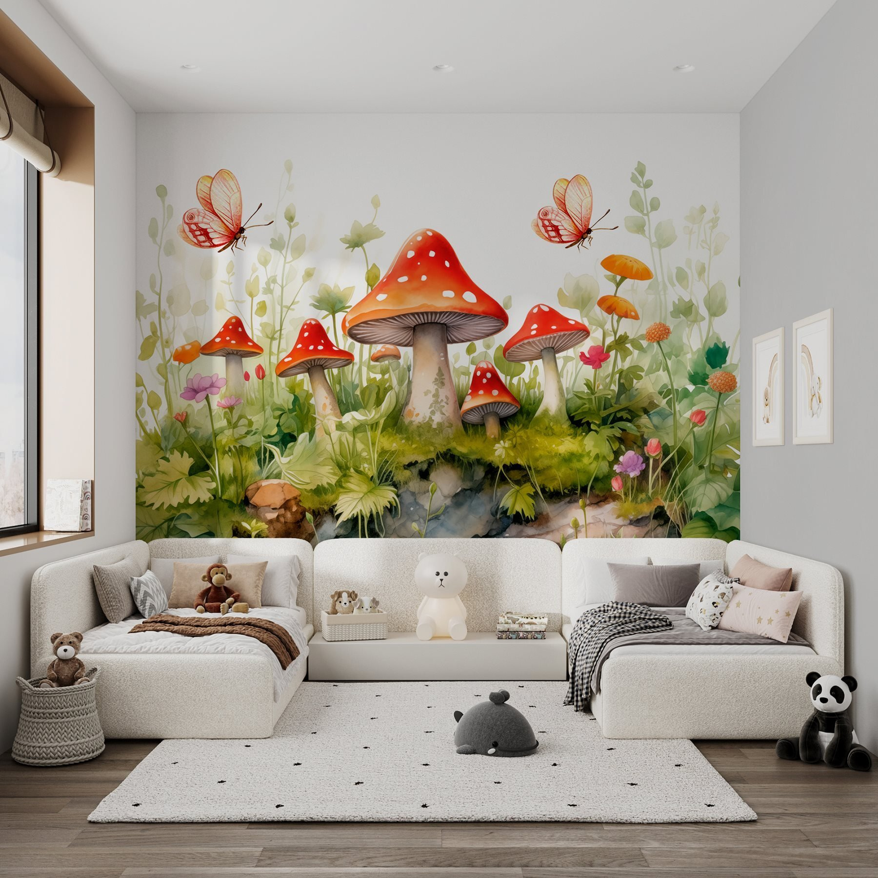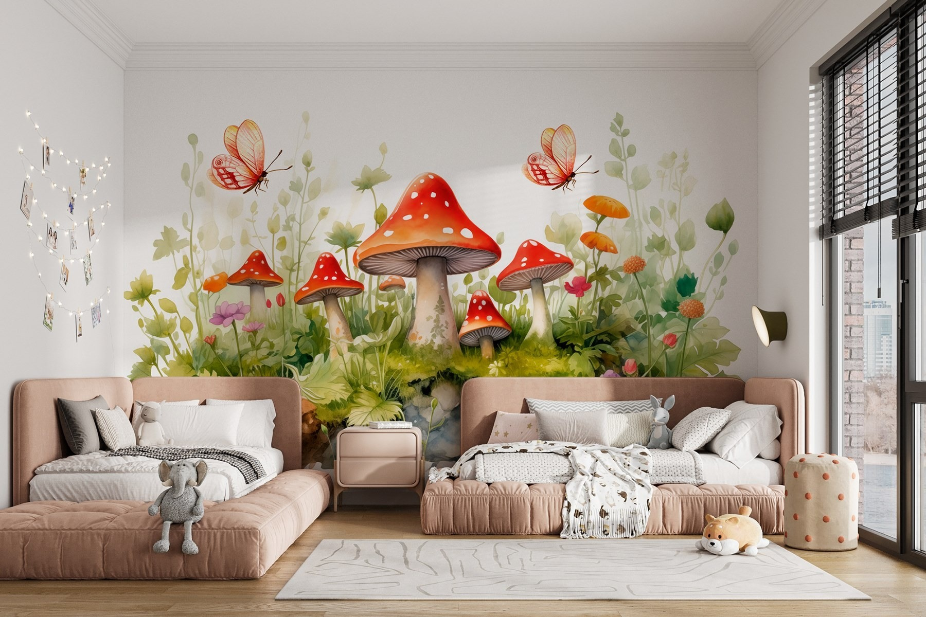 Odmień swoją przestrzeń dzięki tej czarującej fototapecie ściennej z uroczymi grzybami i delikatnymi motylami. Wyobraź sobie, że wchodzisz do pokoju, w którym kaprys natury tańczy wokół ciebie. Żywe czerwone kapelusze grzybów wyskakują jak cukierki w lesie, podczas gdy delikatne pastelowe kwiaty wyglądają przez bujną zieleń. A te motyle? Czysta magia, przelatujące przez scenę, jakby miały gdzieś specjalne miejsce. To jak przeniesienie fragmentu bajki do domu, zapraszając do zatrzymania się i docenienia małych cudów życia. Ta fototapeta nie tylko zdobi – ona tryska radością! Idealna do przytulnego kącika, pokoju dziecięcego lub dowolnego miejsca, w którym przydałaby się odrobina radości.
