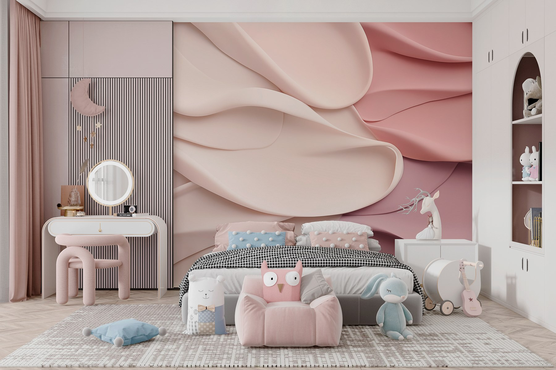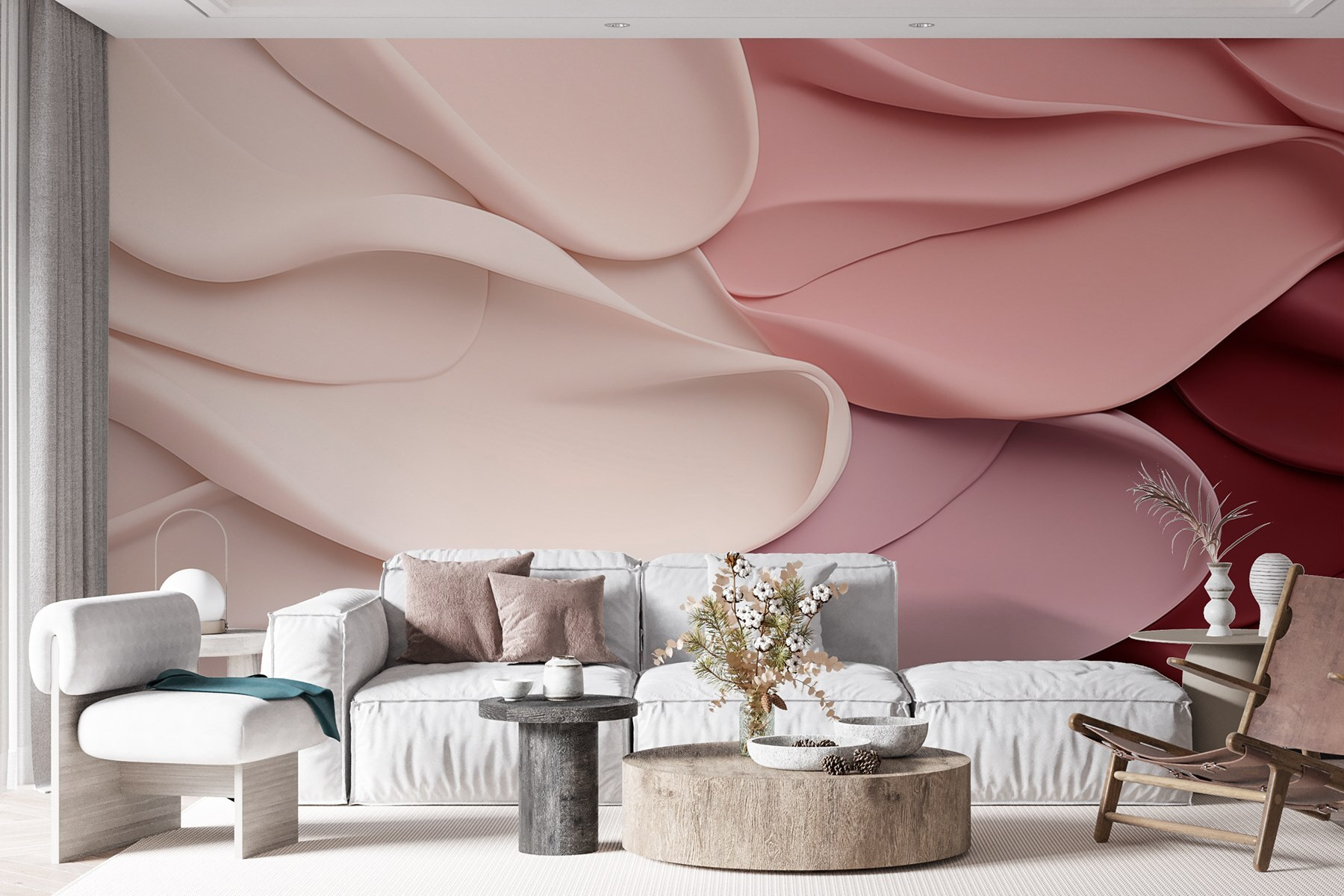 Odmień każde pomieszczenie dzięki tej zachwycającej fototapecie ściennej przedstawiającej figlarny taniec różowych i białych falujących tkanin. Wyobraź sobie, że wchodzisz do przestrzeni, która przypomina przytulny uścisk, gdzie miękkie fale tworzą poczucie spokoju i komfortu. To jak wprowadzenie odrobiny delikatnej elegancji do domu. Idealna do kącika do czytania lub spokojnej sypialni, ta fototapeta może zainspirować spokojne chwile – wystarczy pomyśleć o zwinięciu się w kłębek z dobrą książką w otoczeniu kojących wibracji. Kto nie pokochałby tła, które sprawia wrażenie przytulnego koca na ścianach? Jest to sztuka, której chce się dotknąć, początek rozmowy, który dodaje ciepła bez przytłaczania. Niezależnie od tego, czy jest to gruntowna renowacja, czy tylko małe odświeżenie, ta fototapeta sprawi, że twoja przestrzeń poczuje się wyjątkowo.