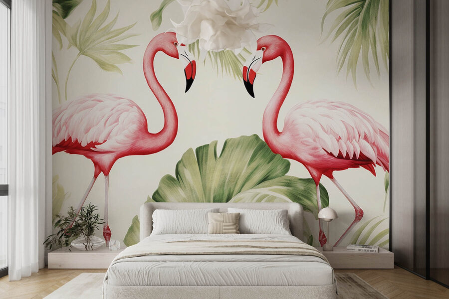 Przekształć swoją przestrzeń w tropikalny raj dzięki tej żywej fototapecie ściennej przedstawiającej parę żywych różowych flamingów otoczonych bujnymi zielonymi liśćmi. To jak mini wakacje w twoim domu! Wyobraź sobie, że każdego dnia budzisz się z tymi dziwacznymi ptakami figlarnie pozującymi na miękkim tle. Świeże kolory tchną życie w każde pomieszczenie, sprawiając, że poczuje się ono zachęcająco i zabawnie. Niezależnie od tego, czy jest to przytulny salon, czy inspirujące miejsce do pracy, ta fototapeta doda odrobinę osobowości. Przyjaciele i rodzina z pewnością będą o niej rozmawiać. Może nawet uda ci się wypić koktajl z flamingiem w przyszłości!