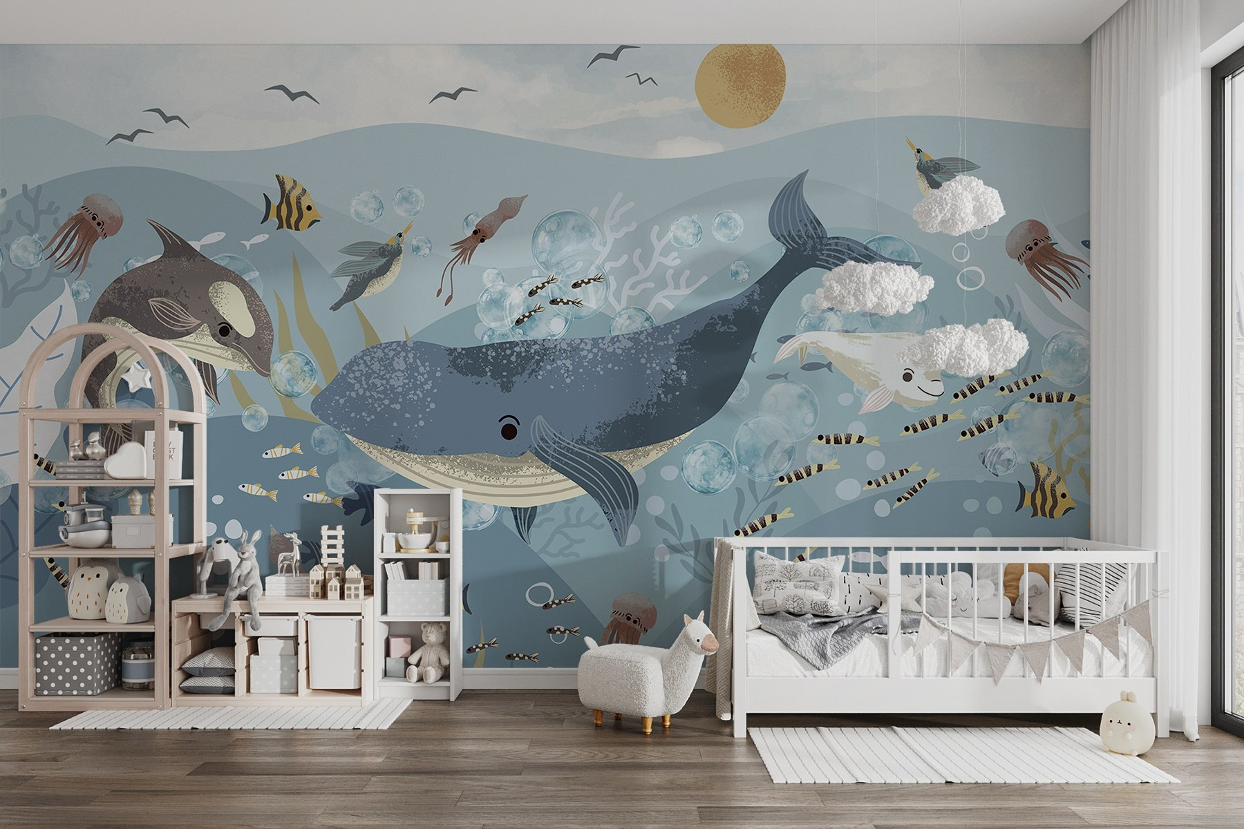 Zanurz się w świecie fantazji dzięki tej fototapecie przedstawiającej żywą mieszankę ryb i wielorybów bawiących się pod łagodnymi falami oceanu. Wyobraź sobie dzieci chichoczące, obserwujące kolorowe meduzy i urocze delfiny przepływające obok. To jak karmienie wyobraźni śniadaniem z dodatkiem przygody! Przyjaciele będą dryfować w pokoju, natychmiast czując chłodną oceaniczną bryzę (lub przynajmniej ją sobie wyobrażając). Idealna do pokoju dziecięcego lub przytulnego kącika do czytania, ta fototapeta zamieni każdą ścianę w plusk szczęścia. Więc śmiało, niech ta podwodna impreza rozjaśni te nudne przestrzenie!