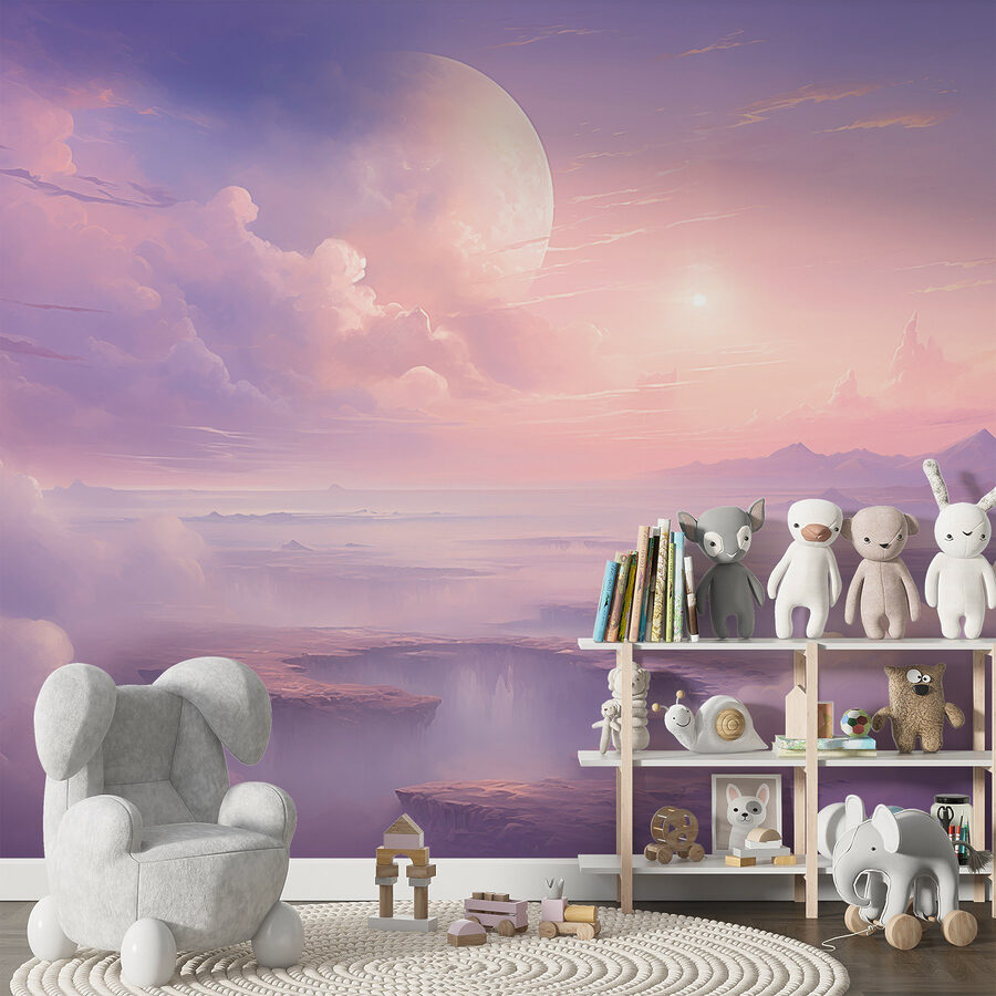 Odmień swoją przestrzeń dzięki tej marzycielskiej fototapecie ściennej przedstawiającej oszałamiający krajobraz, w którym puszyste chmury obejmują świecący księżyc. To jak przeniesienie spokojnego piękna zmierzchu prosto do domu. Wyobraź sobie wylegiwanie się na kanapie, popijając herbatę i pozwalając, by ogarnęły cię uspokajające kolory – delikatne fiolety, ciepłe róże i delikatne chmury, które aż proszą się o marzenia.