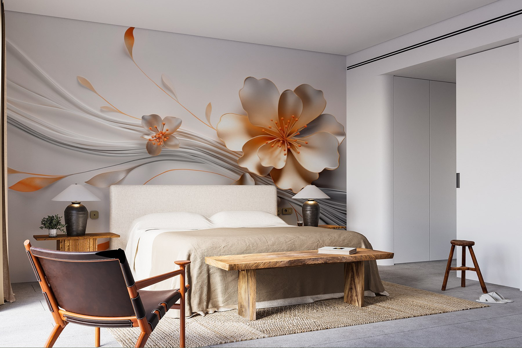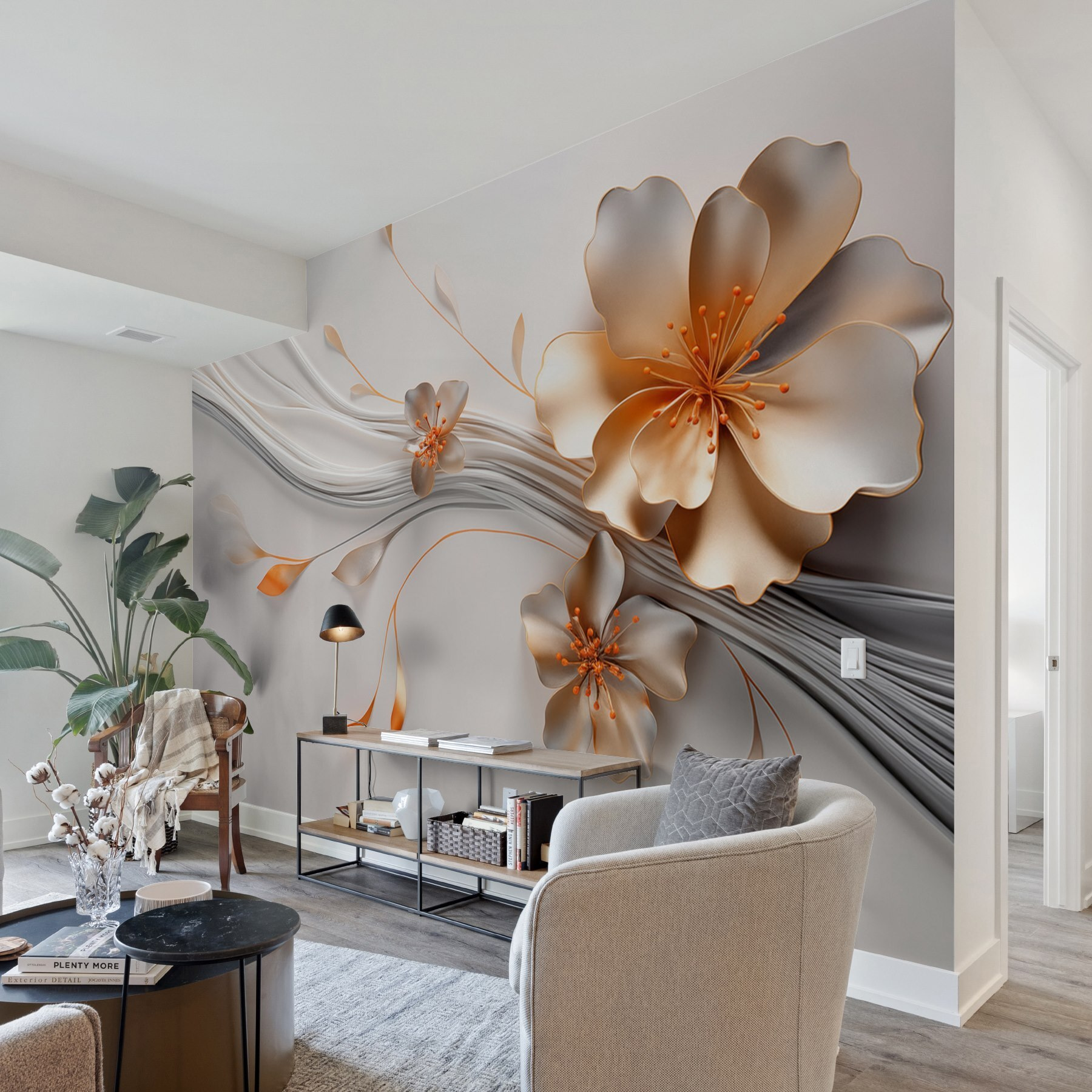 Przekształć dowolny pokój w spokojną ucieczkę dzięki tej eleganckiej fototapecie w kwiaty. Wyobraź sobie, że wchodzisz do swojej przestrzeni i natychmiast czujesz uspokajającą obecność płynnych linii i delikatnych kwiatów. To jak posiadanie ogrodu w domu bez konieczności podlewania! Delikatne odcienie wnoszą ciepło i odrobinę kaprysu, idealne do rozjaśnienia nudnej ściany. Znajomi mogą pomylić go z fantazyjną tapetą lub, kto wie, mogą zapytać, gdzie jest najbliższa kwiaciarnia! Idealna do przytulnych zakątków lub przestronnych salonów, ta fototapeta to wspaniały początek rozmowy.