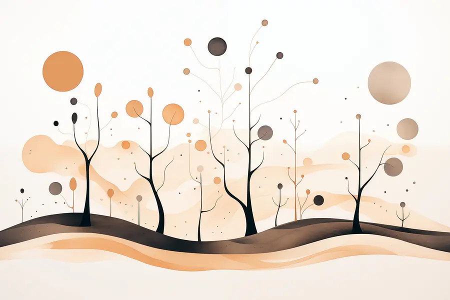 Przekształć dowolną przestrzeń w spokojne miejsce dzięki tej urzekającej fototapecie ściennej z kapryśnymi drzewami i łagodnymi, płynnymi kształtami. Wyobraź sobie, że wchodzisz do sennego krajobrazu za każdym razem, gdy wchodzisz do pokoju. Ciepłe kolory delikatnych pomarańczy i ziemistych brązów tworzą przytulną atmosferę, idealną do inspirowania kreatywności lub po prostu relaksu po długim dniu.