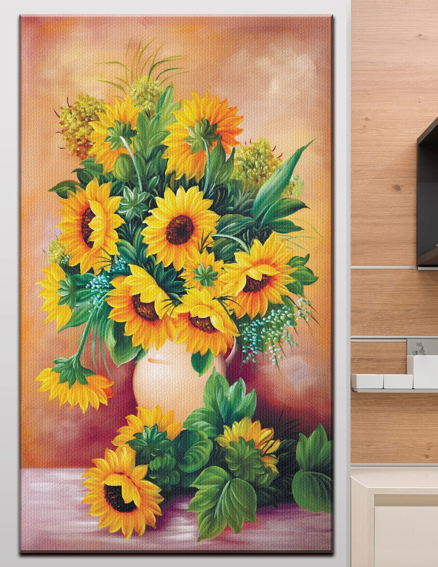 Rozjaśnij każde pomieszczenie dzięki temu wspaniałemu obrazowi na płótnie przedstawiającemu słoneczniki w wazonie. Te wesołe żółte kwiaty praktycznie tryskają energią, wołając każdego, kto przechodzi obok. Wyobraź sobie ten obraz wiszący w przytulnej kuchni lub gościnnym salonie – natychmiast podnosi na duchu! Ciepłe tło dodaje odrobinę spokoju, dzięki czemu jest idealnym uzupełnieniem każdego stylu wystroju. To jak mały kawałek lata przez cały rok, przypominający wszystkim o tym, by cieszyć się słońcem, nawet w pochmurne dni. Przygotuj się na komplementy od gości – to prawdziwy początek rozmowy!