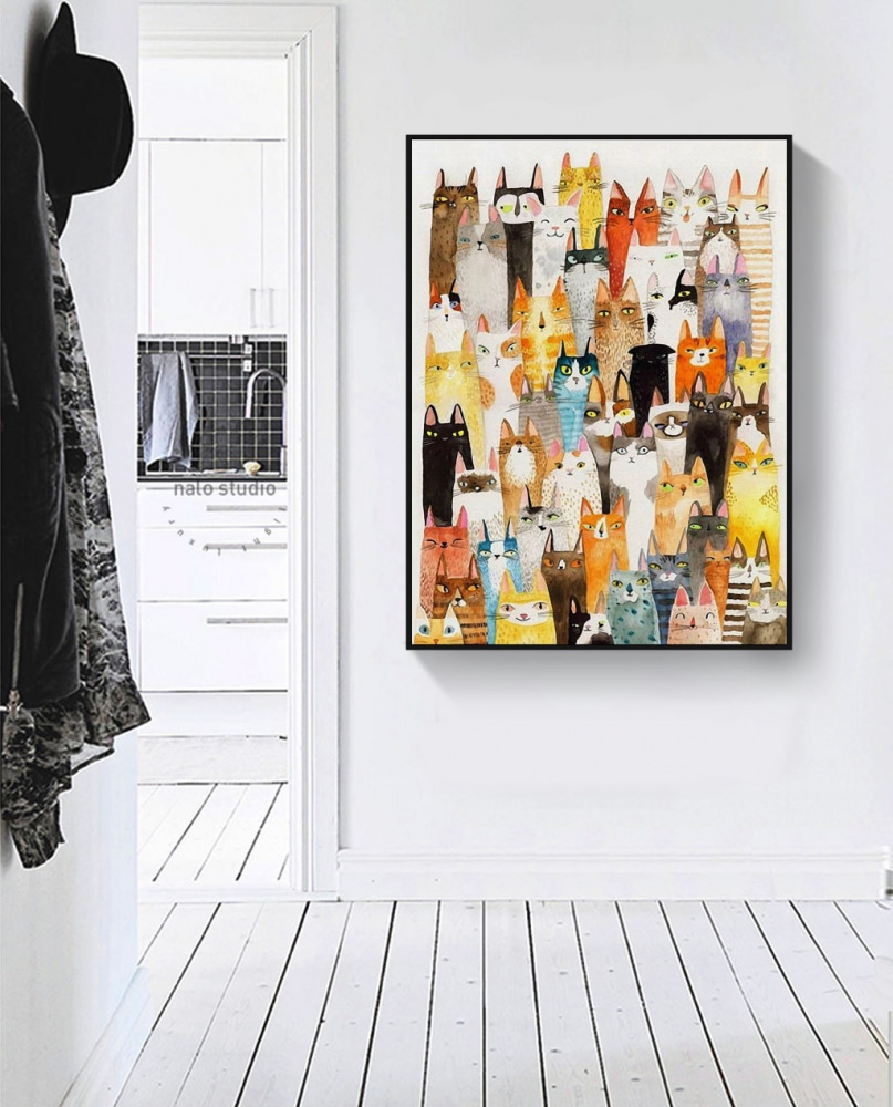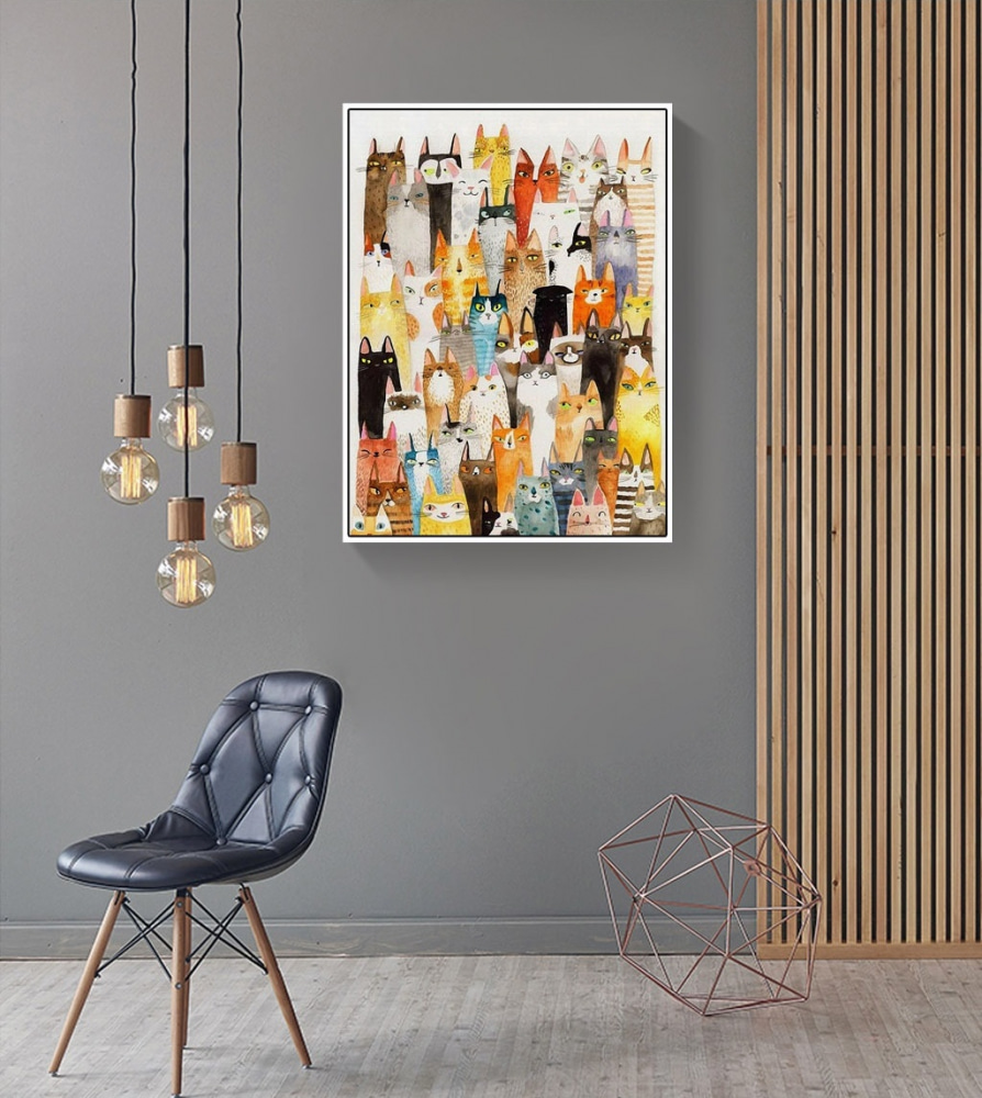 Wyobraź sobie, że budzisz się ze ścianą pełną kolorowych, ciekawskich kotów, które wpatrują się w ciebie tymi szerokimi, figlarnymi oczami. Ten wydruk na płótnie “Colorful Cats Gather with Curious Eyes” to natychmiastowa poprawa nastroju! Cała gromada dziwacznych kotów, każdy z własną uroczą osobowością – to tak, jakbyś miał mini paradę kotów w swoim salonie. Idealny dla każdego, kto nie może oprzeć się odrobinie kapryśnego uroku w swoim domu. Wyobraź sobie, jak goście chichoczą, gdy dostrzegają swojego ulubieńca – “Och, ten zdecydowanie ma tajemnicę!”. Niezależnie od tego, czy chodzi o pokój dziecięcy, czy dziwaczny kącik do czytania, ten element po prostu tryska radosną, zabawną atmosferą. I wiesz co? Z pewnością sprawi, że nawet najbardziej zrzędliwy dzień stanie się odrobinę lżejszy.