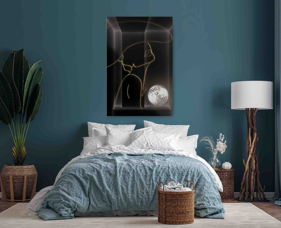 Odmień swoją przestrzeń dzięki temu urzekającemu drukowi na płótnie przedstawiającemu stylową kobietę i kulę dyskotekową, wnosząc odrobinę kaprysu i uroku. Wyobraź sobie, że rozjaśnia przytulny kącik lub ożywia rozmowę w salonie. Proste linie wzoru przywołują poczucie elegancji, a kula dyskotekowa dodaje zabawnego akcentu – idealnego dla każdego, kto uwielbia dobrą imprezę taneczną, nawet jeśli odbywa się ona tylko w salonie. To jak natychmiastowy poprawiacz nastroju! Zawieś go i pozwól mu zainspirować się do spontanicznego tańca, bo kto powiedział, że ściany nie mogą być zabawne?