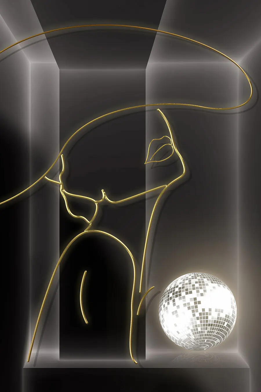 Odmień swoją przestrzeń dzięki temu urzekającemu drukowi na płótnie przedstawiającemu stylową kobietę i kulę dyskotekową, wnosząc odrobinę kaprysu i uroku. Wyobraź sobie, że rozjaśnia przytulny kącik lub ożywia rozmowę w salonie. Proste linie wzoru przywołują poczucie elegancji, a kula dyskotekowa dodaje zabawnego akcentu – idealnego dla każdego, kto uwielbia dobrą imprezę taneczną, nawet jeśli odbywa się ona tylko w salonie. To jak natychmiastowy poprawiacz nastroju! Zawieś go i pozwól mu zainspirować się do spontanicznego tańca, bo kto powiedział, że ściany nie mogą być zabawne?