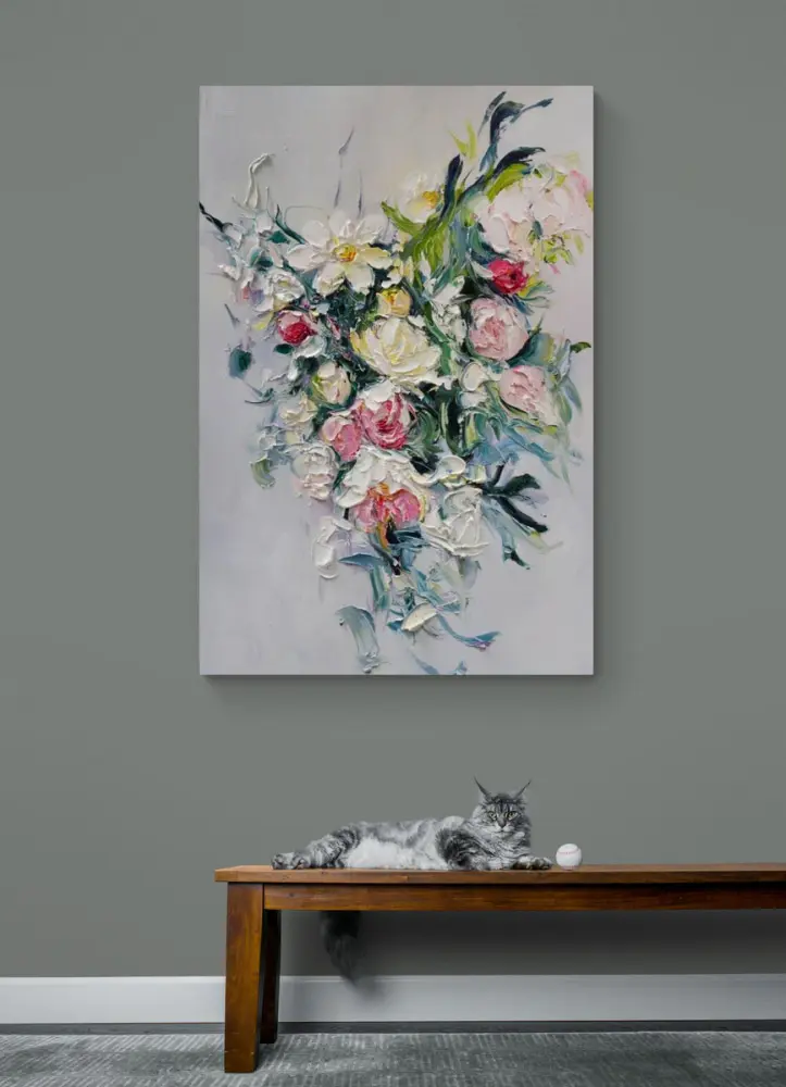 Oto wydruk na płótnie, który doda odrobinę kwiatowego uroku do Twojej przestrzeni. “Malarstwo kwiatów na białej powierzchni” jest idealne dla każdego, kto nie ma dość sztuki pełnej kwiatów. Poważnie, wyobraź to sobie – siedzisz w swoim salonie i bum, codziennie wita cię ten żywy bukiet. Każde pociągnięcie pędzla sprawia wrażenie płatka, którego można niemal dotknąć. Kolory są na tyle żywe, że kwiaty wyglądają na żywe, a jednocześnie na tyle delikatne, że idealnie komponują się z każdym wystrojem.