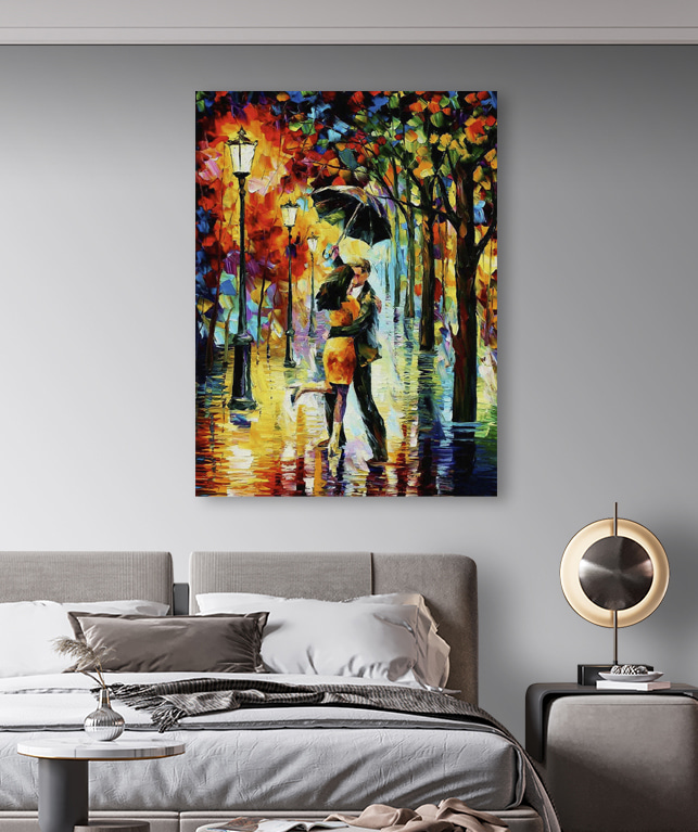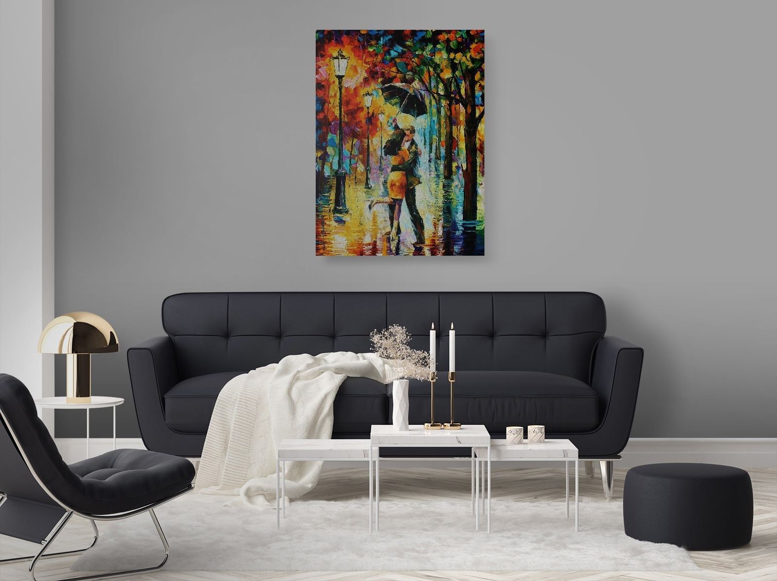 Wyobraź to sobie: pogodny deszczowy wieczór, w którym para dzieli się czułym pocałunkiem pod parasolem. Teraz umieść to na swojej ścianie! Ten żywy wydruk na płótnie oddaje ten magiczny moment z odrobiną kolorów – jak festiwal miłości w deszczu. Idealny dla każdego, kto chce dodać szczyptę romantyzmu do swojej przestrzeni. Jest kolorowy, odważny i z pewnością wywoła uśmiech na twarzy każdego przechodnia, wyobrażając sobie słodką historię miłosną.