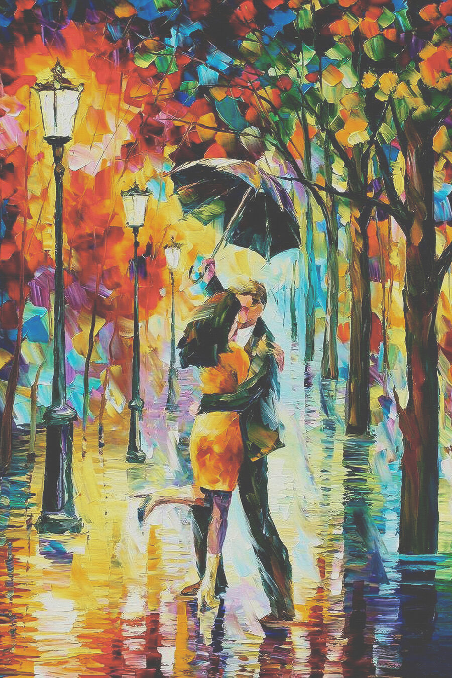 Wyobraź to sobie: pogodny deszczowy wieczór, w którym para dzieli się czułym pocałunkiem pod parasolem. Teraz umieść to na swojej ścianie! Ten żywy wydruk na płótnie oddaje ten magiczny moment z odrobiną kolorów – jak festiwal miłości w deszczu. Idealny dla każdego, kto chce dodać szczyptę romantyzmu do swojej przestrzeni. Jest kolorowy, odważny i z pewnością wywoła uśmiech na twarzy każdego przechodnia, wyobrażając sobie słodką historię miłosną.