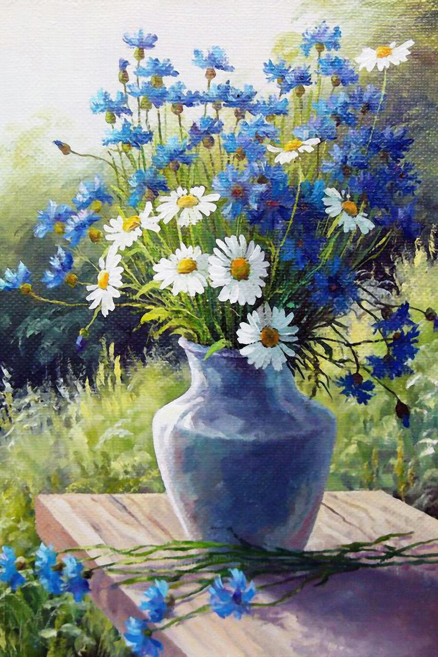 Wyobraź to sobie: spokojny poranek, światło słoneczne wpadające przez okno, odbijające się od pięknego płótna z niebieskimi chabrami i wesołymi stokrotkami w wazonie. Tak, to jest takie dobre. Ten wydruk na płótnie to nie tylko odrobina koloru, ale także cała historia. Idealny do salonu, sypialni lub tej samotnej ściany, którą chciałeś upiększyć. Wnosi odrobinę natury do wnętrza – bez pyłków! Odcienie błękitu i bieli pojawiają się na delikatnym zielonym tle, dzięki czemu kwiaty wyglądają, jakby mogły kołysać się na delikatnym wietrze. Każde spojrzenie na nią sprawia, że uśmiechasz się i czujesz się odrobinę lżej, prawie tak, jakbyś odbył krótki spacer po letniej łące. Ribbit. Czekaj, to żaby. Bzzz. Teraz to pszczoły. W każdym razie, to jak wiosna na płótnie. Przyjazny i gościnny, jak pogawędka ze starym kumplem.