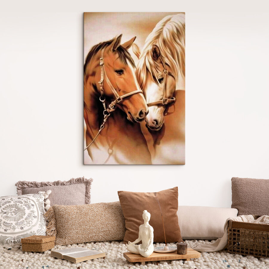 Ten wydruk na płótnie, przedstawiający dwa konie dzielące czułą, spokojną chwilę, jest po prostu uroczy. Wciąga, prawda? Wyobraź to sobie – łagodna scena czystego spokoju i więzi, bezpośrednio na ścianie. Można niemal usłyszeć ciche parsknięcia i poczuć delikatny oddech. Wyobraź to sobie w swoim salonie lub przytulnym kąciku do czytania. Dodaje uspokajającej atmosfery, jakby konie szeptały sekret, który znają tylko one. Dodatkowo, miłośnicy koni, ten jest dla was. To jak przeniesienie kawałka pastwiska prosto do swojej przestrzeni. Zabierze cię na emocjonalną przejażdżkę – za każdym razem, gdy na nią spojrzysz! Założę się, że wywoła też kilka interesujących rozmów. Kto by pomyślał, że prosty obraz może stworzyć tyle ciepła i spokoju? Idealne połączenie!