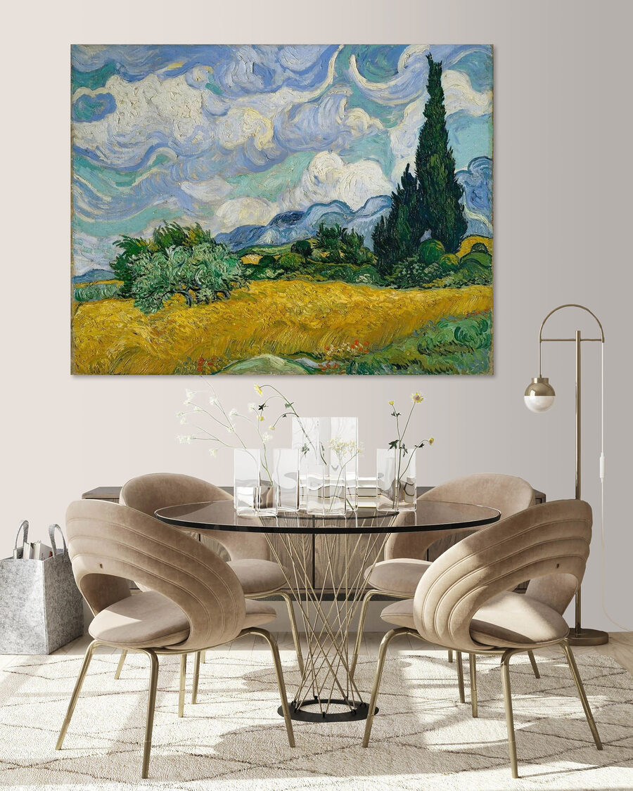 Wyobraź sobie, że wracasz do domu po długim dniu i wita Cię ten uspokajający obraz na płótnie przedstawiający łąkę, drzewa i odległe góry. Ma on ponadczasowy klimat, który może przekształcić każde pomieszczenie w spokojny azyl. Te wirujące chmury i bogate, ziemiste kolory sprawiają, że niemal czujesz, jakbyś słyszał bryzę szeleszczącą wśród liści.