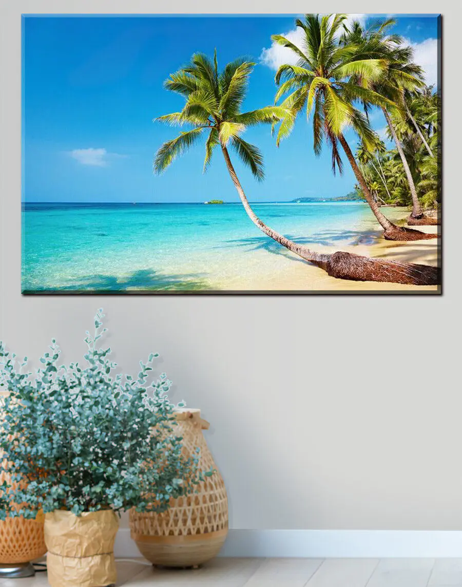 Wyobraź sobie, że wchodzisz do swojego salonu i witasz się z najwspanialszym widokiem palm kołyszących się delikatnie nad nieskazitelną plażą. Ten wydruk na płótnie, trafnie nazwany “Palmy na plaży”, jest jak osobisty kawałek raju – wprost na ścianie. Idealny na te ponure zimowe poranki, kiedy potrzebujesz odrobiny pobudzenia lub po prostu zawsze, gdy pragniesz dawki spokoju natury.