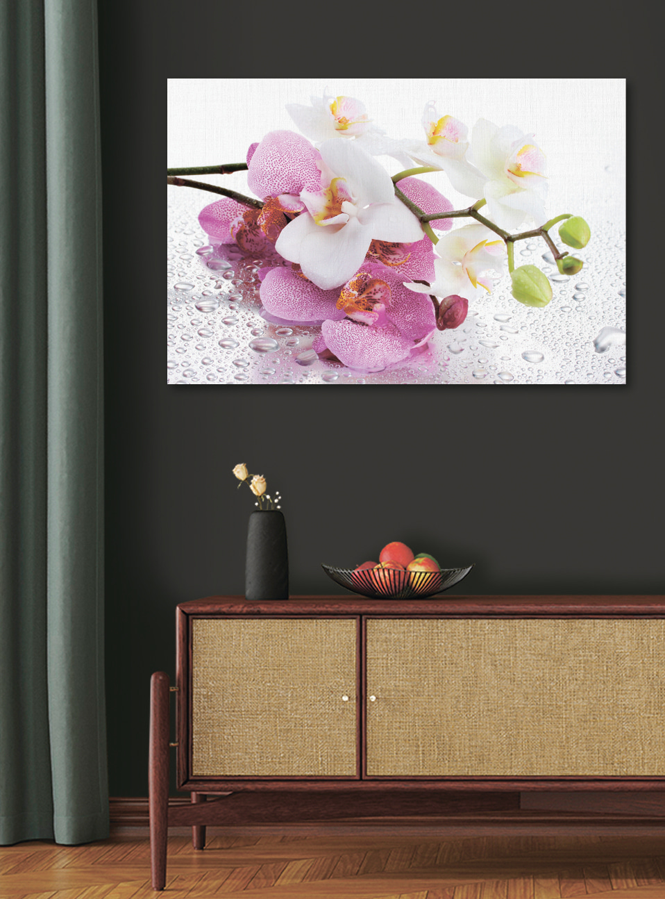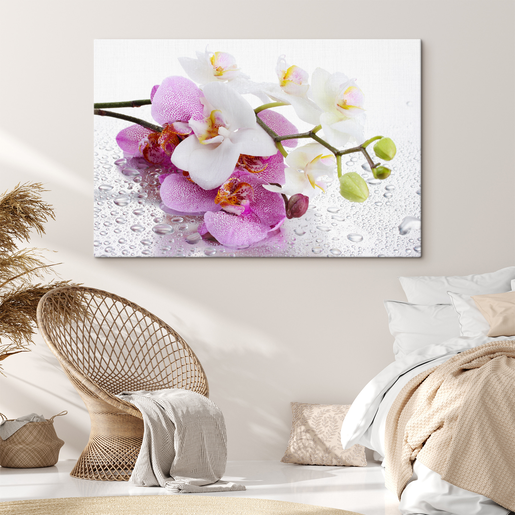 Podnieś swoją przestrzeń dzięki temu oszałamiającemu drukowi na płótnie przedstawiającemu delikatne orchidee całowane przez miękkie krople wody. To jak przeniesienie kawałka natury do wnętrza, bez konewki. Wyobraź sobie, że każdego dnia budzisz się z tym wybuchem koloru – te żywe płatki praktycznie tańczą na płótnie! Idealny do ożywienia salonu lub dodania odrobiny elegancji do sypialni. Dodatkowo, wywołuje odrobinę radości, która przypomina wszystkim, że piękno często znajduje się w najprostszych rzeczach. Kto nie chciałby poczuć się otoczony taką trwałą świeżością? Po prostu powieś go i obserwuj, jak Twoje ściany tchną nowe życie.