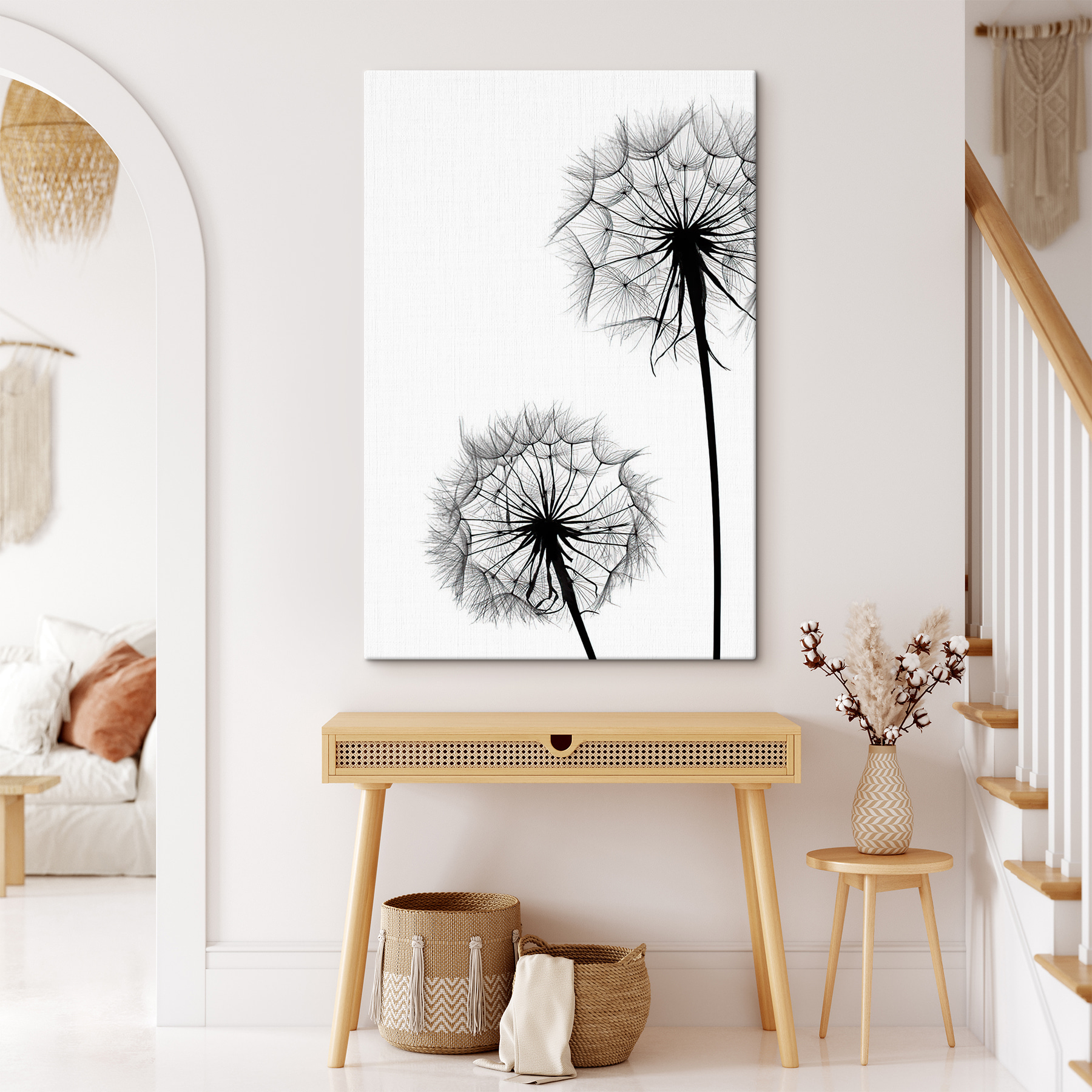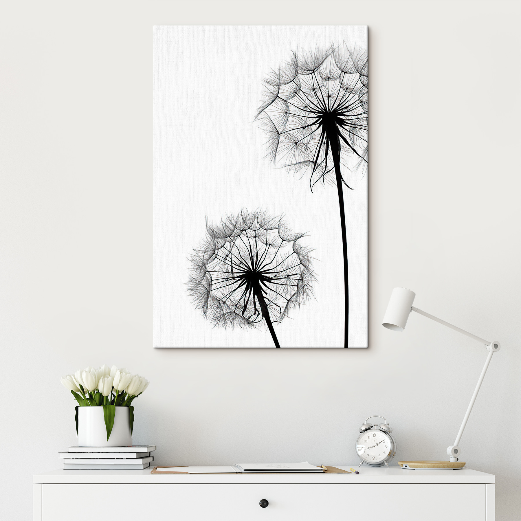 Odmień każdą przestrzeń dzięki temu czarującemu drukowi na płótnie przedstawiającemu sylwetki mniszka lekarskiego wdzięcznie tańczące na wietrze. To urocze połączenie prostoty i elegancji, które sprawia, że z łatwością wpasuje się w każde pomieszczenie. Wyobraź sobie ten urzekający kawałek wiszący w przytulnym kąciku do czytania lub nad spokojnym łóżkiem – urocze, prawda? Każdy mniszek lekarski wydaje się opowiadać historię, jakby dzielił się życzeniami od delikatnej bryzy. Ta grafika wywołuje poczucie spokoju i kaprysu, inspirując marzenia i nostalgiczne chwile. Idealny do dodania odrobiny natury bez konieczności posiadania zielonego kciuka!