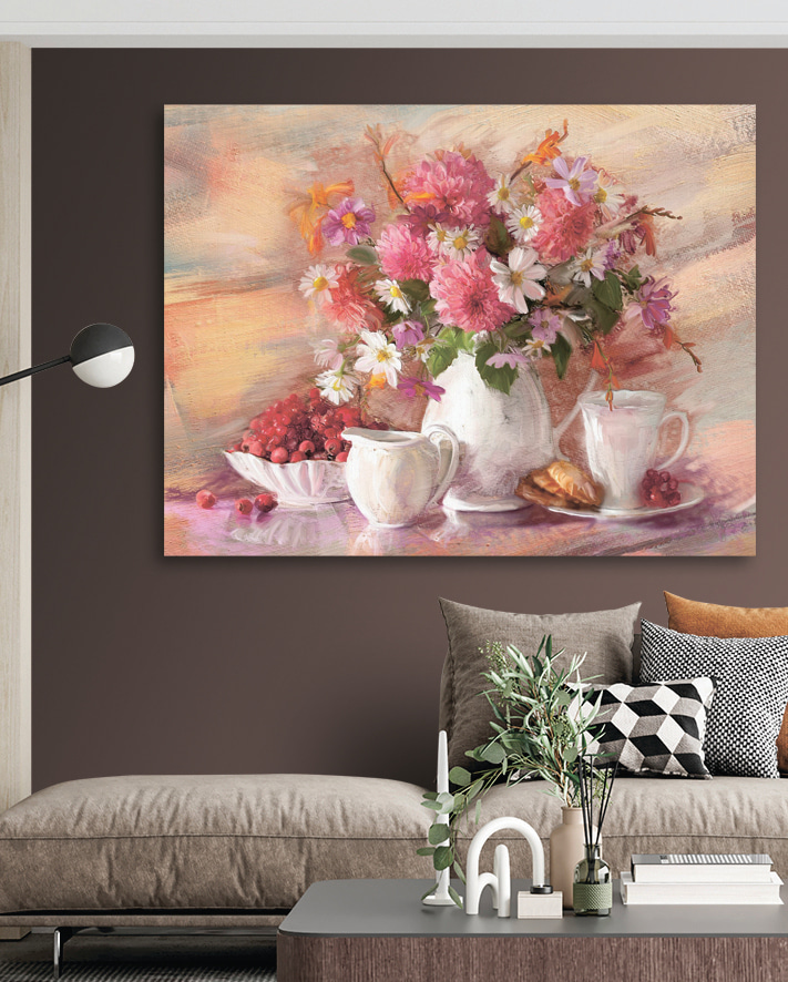 Wyobraź sobie: wracasz do domu po długim dniu, siadasz na kanapie i spoglądasz na płótno na ścianie. Nagle otacza Cię powiew świeżego powietrza – delikatny dotyk natury w Twoim salonie. “Obraz Flowers, tea, and berries delight” pozwala poczuć się jak wiosną przez cały rok. Miękkie płatki, delikatna porcelana i te soczyste jagody – sprawiają, że chce się nalać filiżankę herbaty i odpocząć. Idealny do dodania odrobiny koloru i spokoju do każdej przestrzeni. Ma ten przytulny, ale żywy klimat, który jest odpowiedni dla twojego ulubionego zakątka.