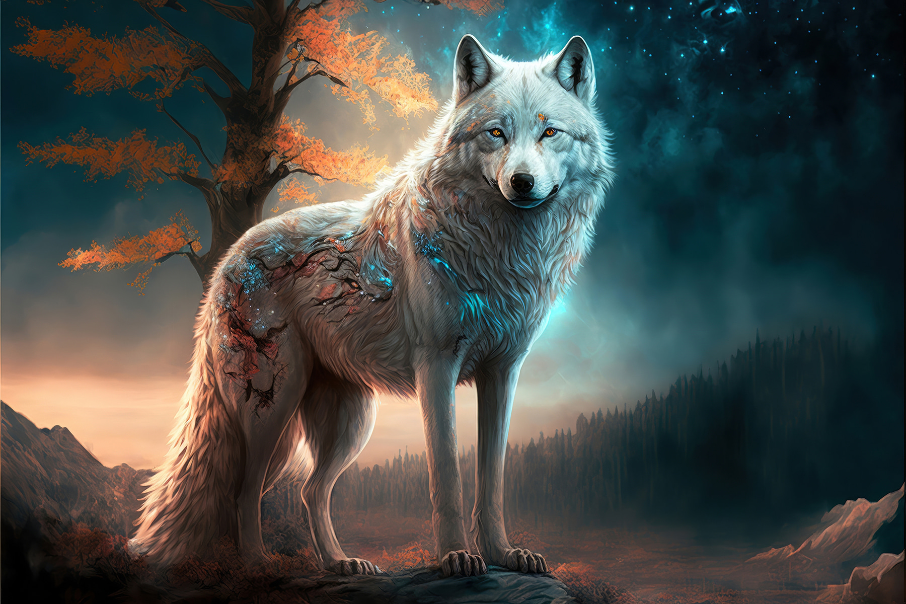 Wkrocz do świata, w którym natura i magia spotykają się z tym oszałamiającym wydrukiem na płótnie przedstawiającym mistycznego wilka pod rozgwieżdżonym niebem. To coś więcej niż tylko dzieło sztuki; to okno do czarującej krainy, która zachęca do marzeń i dzikich myśli. Wyobraź to sobie: przytulny zakątek w Twoim domu, nad którym czuwa to majestatyczne stworzenie, dodając odrobinę przygody do Twojego codziennego życia.
