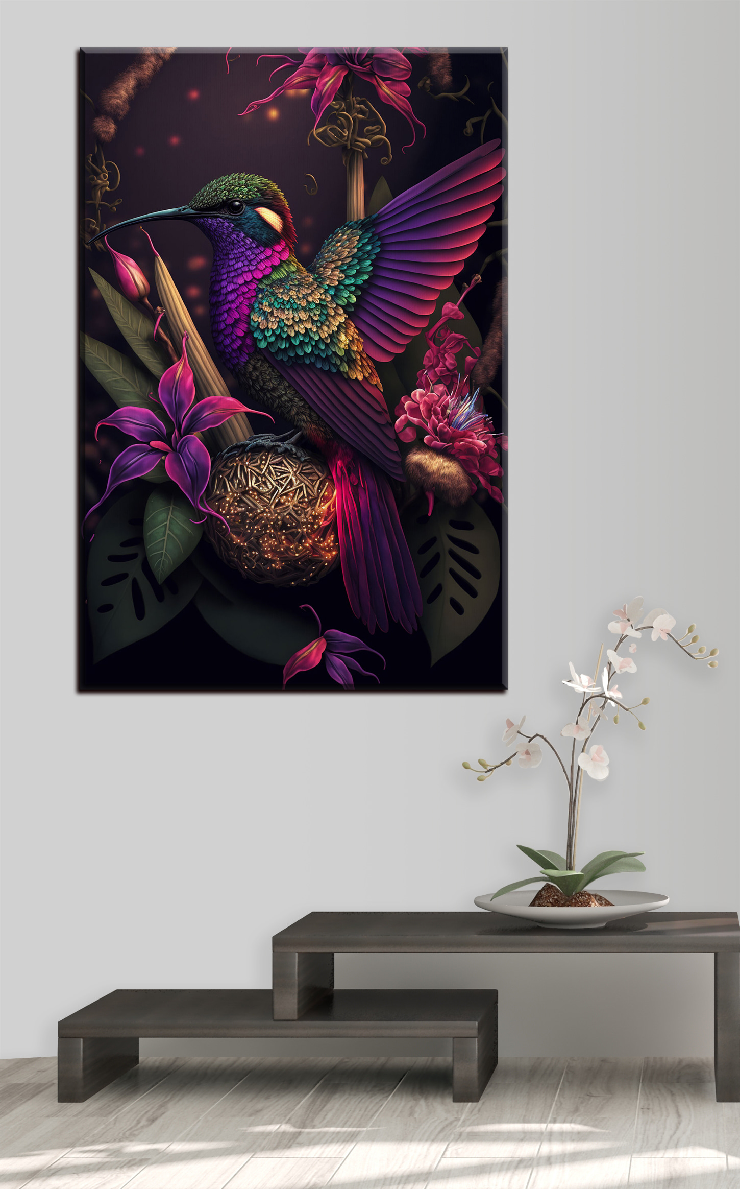 Sprawdź to: “Vibrant Hummingbird Among Exotic Blooms” to jak wzięcie najbardziej kolorowej parady natury i rozpryskanie jej na ścianie. To nie tylko dzieło sztuki – to eksplozja żywych kolorów, które przyciągną uwagę każdego, kto wejdzie do środka. Wyobraź sobie tego wesołego ptaka w swoim salonie, dodającego radości w ponury dzień. Chodzi o te bogate, głębokie odcienie i drobne, skomplikowane szczegóły kwiatów, które sprawiają, że czujesz się jak w tropikalnym raju.