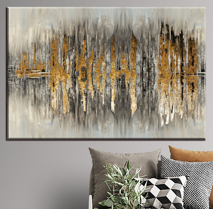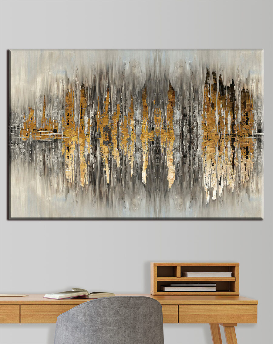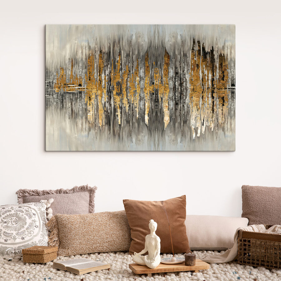 Wyobraź sobie, że wkraczasz w elegancki pejzaż miejski, który wywraca zwykły widok do góry nogami. Ten abstrakcyjny nadruk przedstawia drapacze chmur i odbicia w sposób, który zachęca wszystkich do ponownego spojrzenia. To tak, jakby twoja ściana stała się o wiele fajniejsza. Stonowane odcienie pięknie komponują się z odważnymi kolorami, tworząc spokojną, ale żywą atmosferę. Idealny na pustą ścianę, która aż prosi się o osobowość. Znajomi mogą nawet zatrzymać się i gapić, zastanawiając się, gdzie to znalazłeś. Mały kawałek miejskiej magii w Twoim domu – kto by tego nie pokochał?